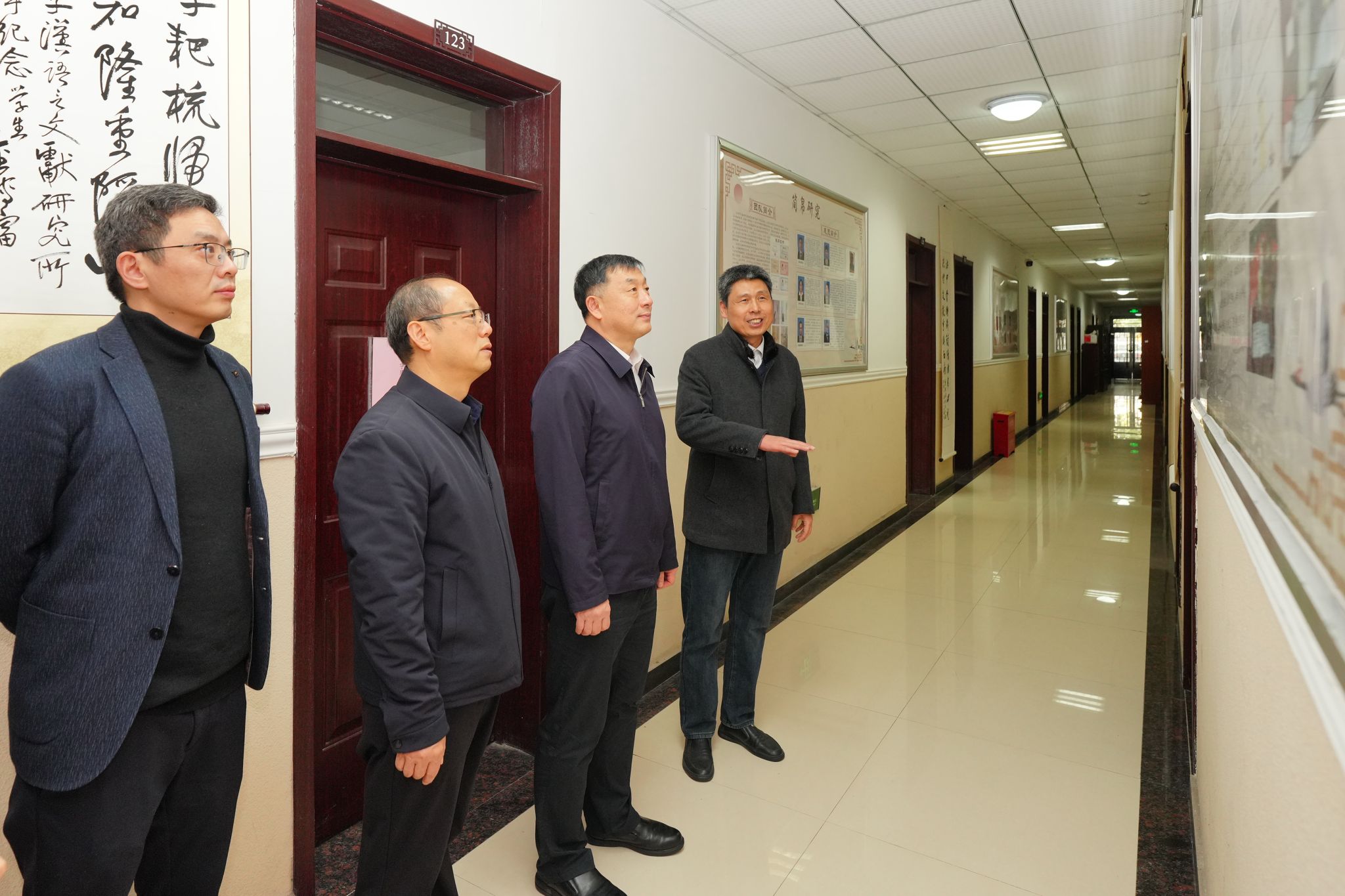在汉语言文献研究所,孟蓬生教授向王晖汇报了《纳西东巴文献字释合集》《简帛艺术综合研究丛书》等标志性成果,以及国家社科基金冷门绝学研究进展。王晖谈到,文献所深耕冷门绝学、守护文化根脉的学术坚守,为语言文字事业提供了重要支撑。
