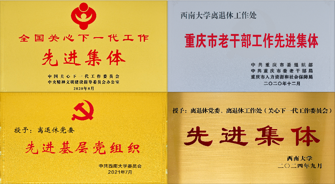 积极搭建平台,引导离退休老同志为国家发展和学校事业贡献“银发力量”。积极参与教育部“国家银龄教师行动计划”,派出银龄教师142人次赴新疆塔里木大学、广西河池学院等17所高校援教。“缙云银晖”党建示范团队、关工委“西大红”五老志愿服务团持续开展学生帮扶、理论宣讲、乡村振兴等活动,100余名老党员、老专家、老教师辅导学生1000余名,培训技术骨干、村干部等2000余人。关工委工作屡获佳绩,被评为全国关心下一代工作先进集体、重庆市“中华魂”主题教育读书活动20周年优秀组织单位,多次获得市教委关工委“中华魂”主题教育读书活动优秀组织奖。“读懂中国”活动总分排名在教育部直属高校中持续名列前茅,2023年排名第一。