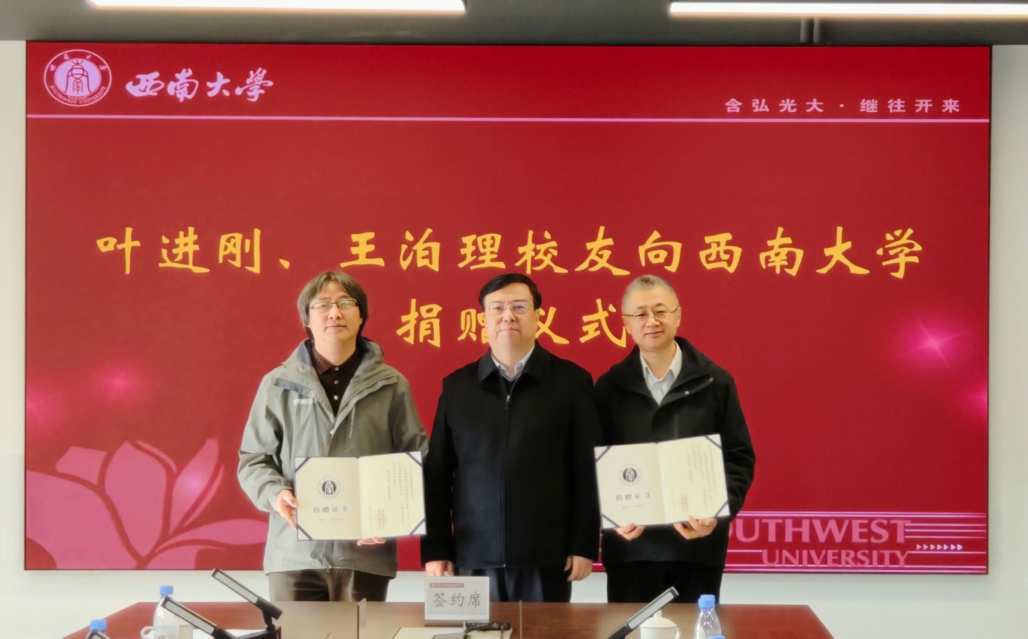 会上,对外联络办公室主任、教育基金会秘书长唐军分别与叶进刚、王泊理,朱继伟、毛艺签署捐赠协议。唐军与植物保护学院党委书记刘立广共同接收捐赠支票。王进军为捐赠者颁发捐赠荣誉证书。