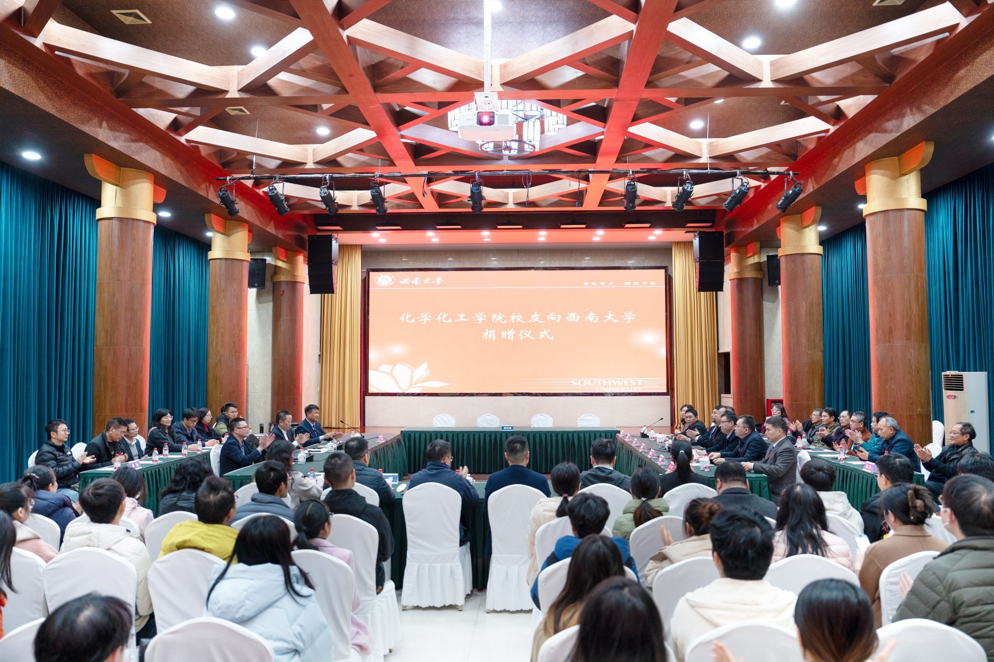 12月5日下午,化学化工学院校友向贝博艾弗森代言体育官网捐赠仪式在东方红会议厅举行。聚慧食品科技(重庆)有限公司董事长苟中军、上海美农生物科技股份有限公司质量总监孙磊(代表洪伟校友)、江苏慧聚药业股份有限公司研发副总胡林(代表邹平校友)一行返校捐赠;学校校长、校友总会会长王进军,副校长廖晓衡出席仪式;党政办公室、对外联络办公室、化学化工学院等单位负责人及师生代表参加。仪式由廖晓衡主持。