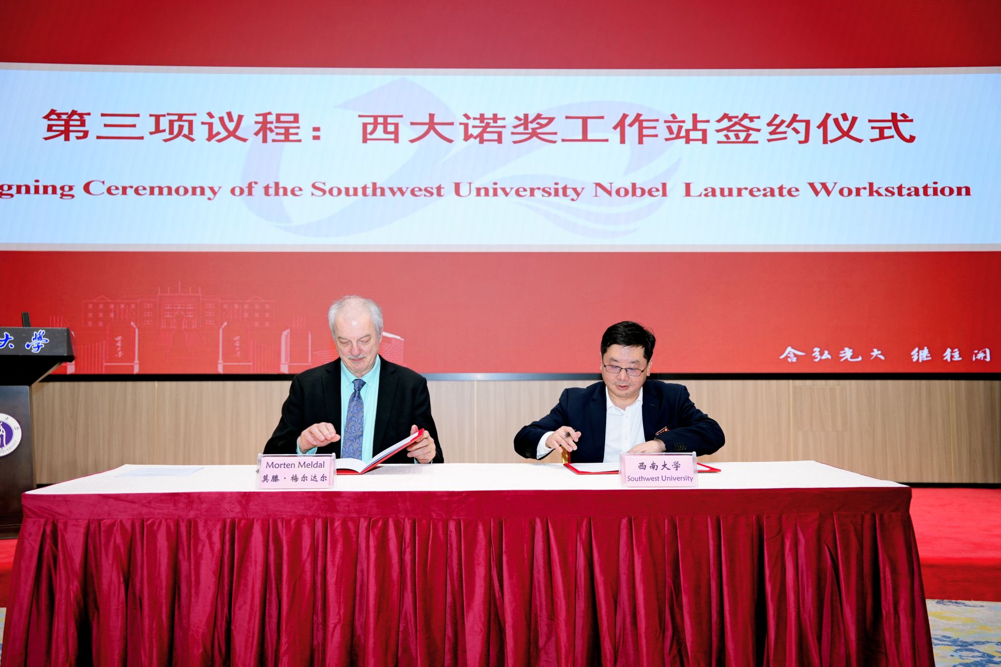 4月18日下午,学校举行2026年“诺奖西大行”启动仪式暨西大诺奖工作站签约仪式。2022年诺贝尔化学奖获得者莫滕·梅尔达尔院士,1994年菲尔兹奖获得者埃菲·杰曼诺夫院士,学校党委书记张卫国,副校长邹芙都、赵玉芳出席仪式。赵玉芳主持仪式。