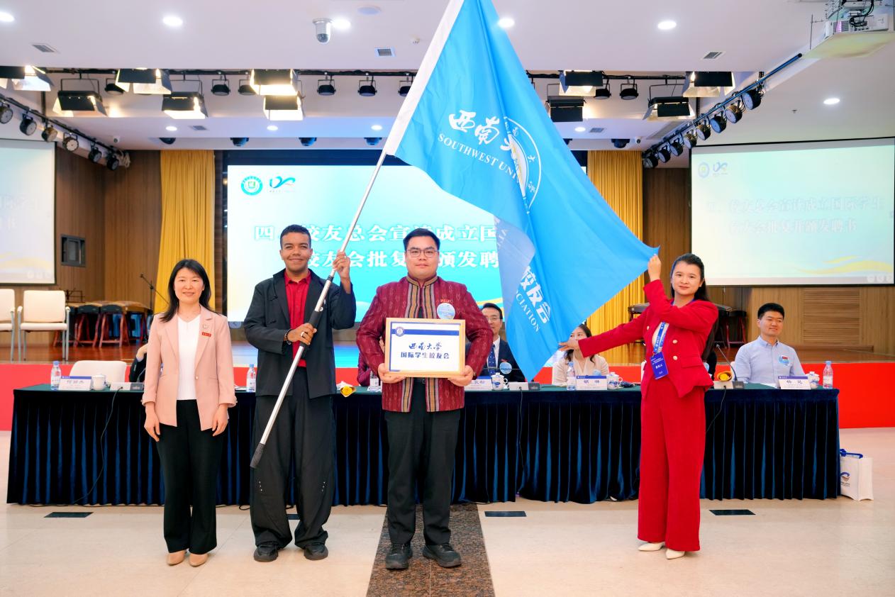 当天,学校还举行了贝博艾弗森代言体育官网国际学生校友会成立仪式,宣读了《关于同意筹备成立贝博艾弗森代言体育官网国际学生校友会的批复》,颁发会牌、会旗,并为首届校友会会长罗俊勇(泰国)、副会长黎氏云(越南)、秘书长黄阿里(埃及)颁发聘书。
