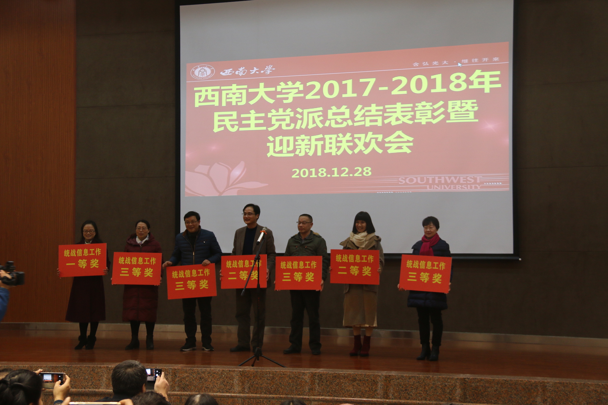 活动分为两个阶段,第一阶段为总结表彰。周文全部长在致辞中通报了学校和统战工作取得的主要成绩,向全体党外人士为学校建设、改革、发展中作出的突出贡献表示衷心感谢,并致以新春祝福。周部长希望学校各民主党派基层组织继续发扬民主党派优良传统,不忘多党合作初心,牢记新时代责任使命,不断把党派工作提高到新水平,始终坚持好、发展好、完善好新型政党制度;希望各民主党派成员坚持以习近平新时代中国特色社会主义思想为指导,把思想和行动统一到中央决策部署和学校中心工作上来,广泛凝聚共识,立足本职岗位,扎实工作,开拓创新,为书写好新时代学校改革发展“奋进之笔”的崭新篇章做出新的更大贡献。
