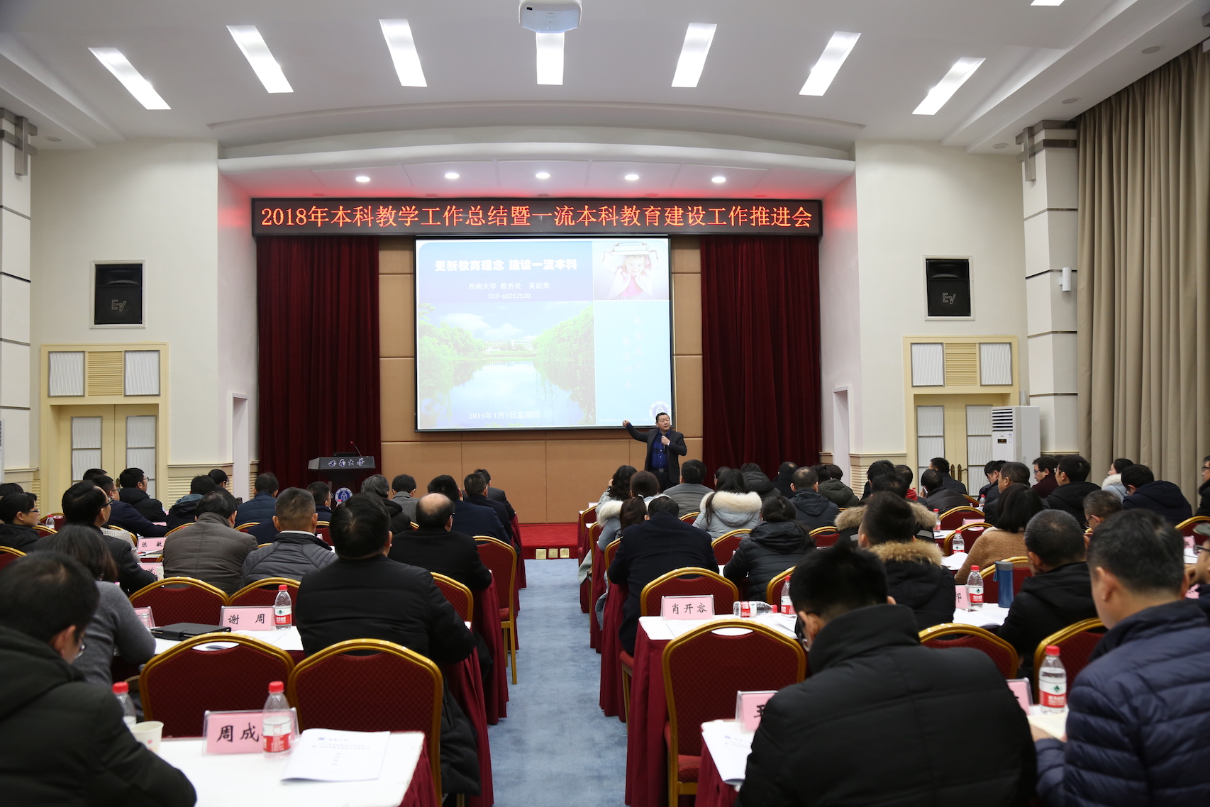 2018年本科教学工作总结暨一流本科教育建设工作推进会1月3日在桂园宾馆金桂厅召开。会议邀请了原厦门大学副校长邬大光教授作主题报告,贝博艾弗森代言体育官网副校长靳玉乐出席会议并讲话,各学院(部)分管本科教学工作副院(部)长、各专业负责人,党委宣传部 党委网络工作部、团委、教务处等职能部门负责人参加会议。会议由靳玉乐副校长主持。