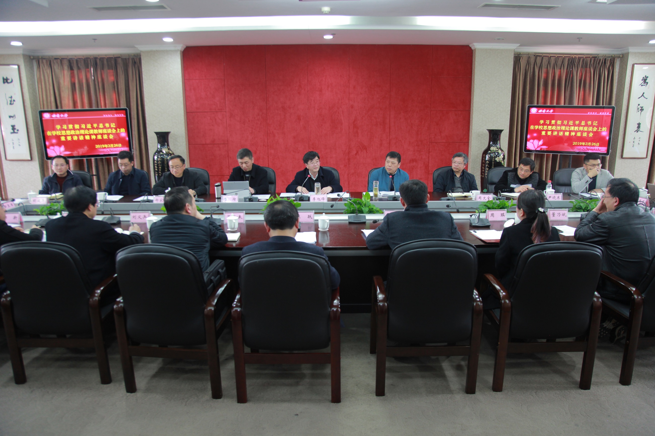 3月26日,学校召开学习贯彻习近平总书记在学校思想政治理论课教师座谈会上的重要讲话精神的学习座谈会,旨在学习领会贯彻落实习总书记重要讲话精神,进一步办好思想政治理论课,落实立德树人根本任务。学校党委书记李旭锋,校长、党委副书记张卫国,党委副书记潘洵及思政课建设领导小组成员单位负责人、思政课教学指导委员会代表、思政课专兼职教师代表、学生代表等参加会议。