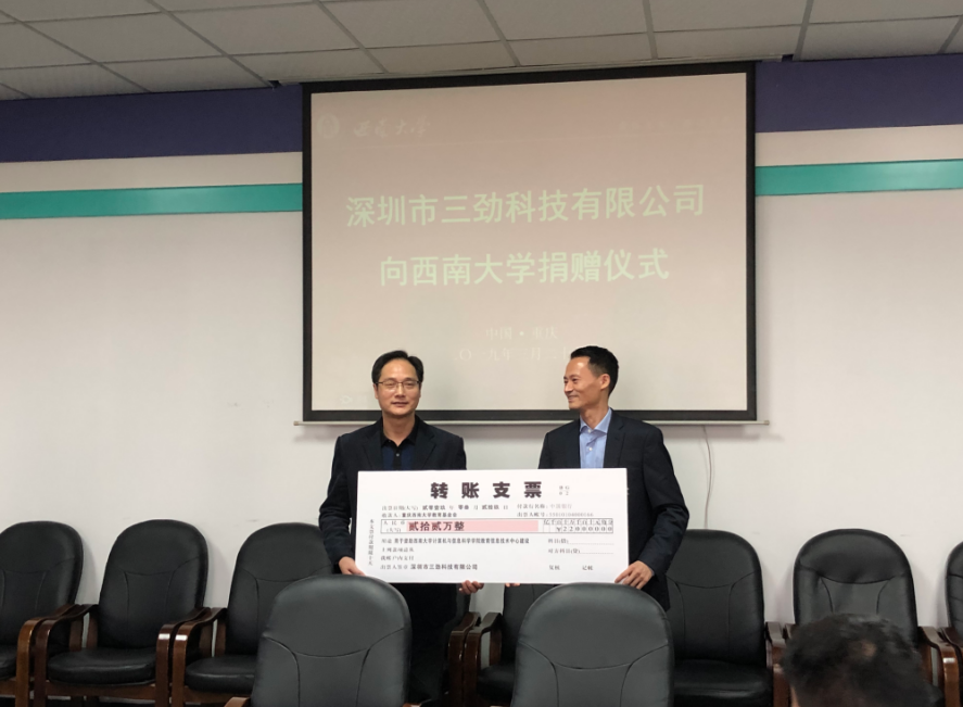 李庆康总裁是深圳市三劲科技有限公司创始人,原西南师范大学外语系91届校友,曾任贝博艾弗森代言体育官网深圳市校友会会长。李总裁一直心系母校,在校友工作、校企合作等方面作出了贡献,此次捐赠既表达了他对母校的深情厚谊,也将双方的合作推向更高的台阶。