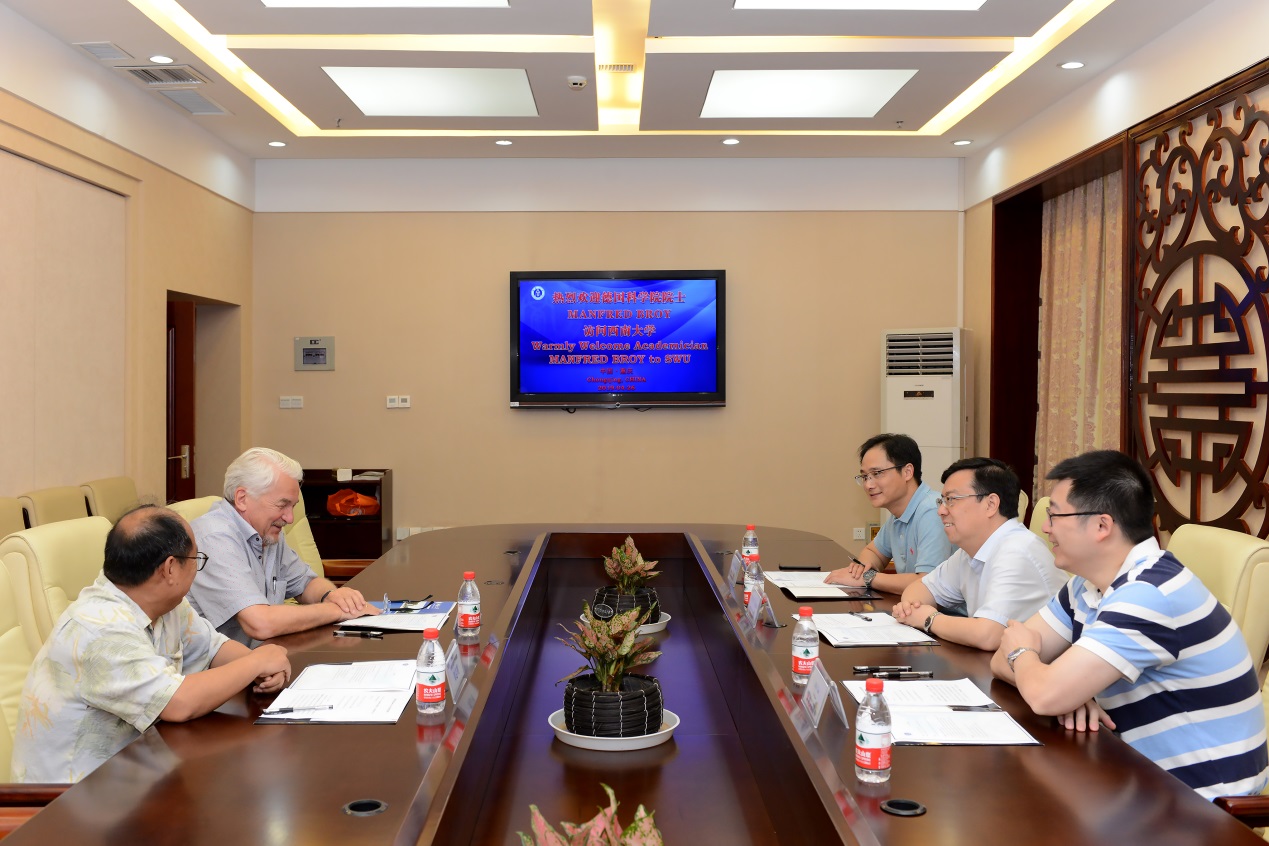 王校长对Manfred Broy院士的来访表示欢迎,简要介绍了学校的基本情况之后,王校长希望Manfred Broy院士今后与计算机与信息科学学院 软件学院开展更多学术合作。陪同会见的国家“千人计划”专家、软件研究与创新中心(RISE)主任刘志明教授介绍了与Manfred Broy院士的学术合作情况,Manfred Broy院士已经来中国多次,但这是他第一次来到重庆。Manfred Broy院士感谢王校长的会见,表示非常愿意与学校开展更多合作。
