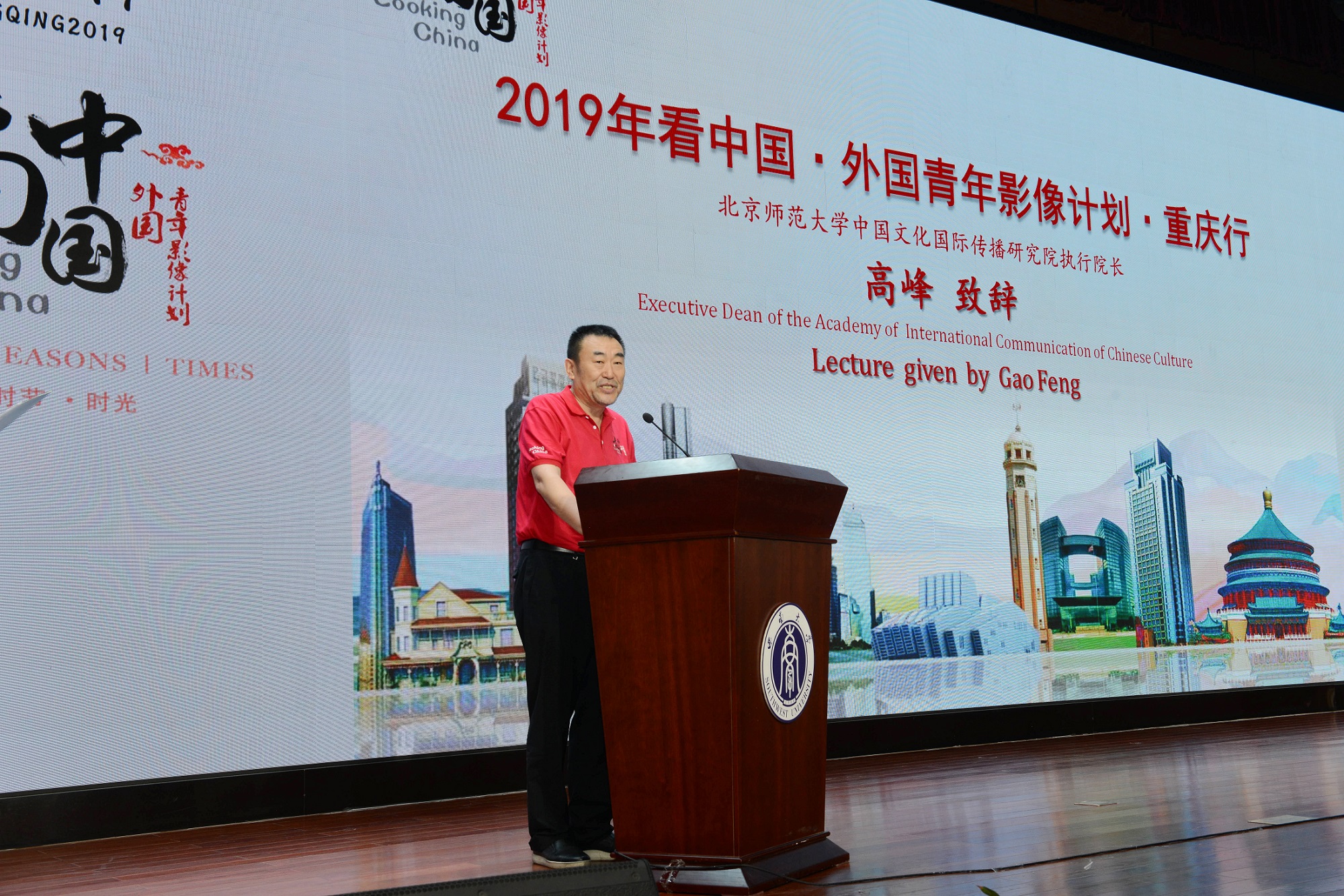 4月24日,2019“看中国•外国青年影像计划”重庆行展映仪式在重庆日报报业集团新闻传媒大厦新闻发布厅举行。学校副校长温涛,重庆市政府新闻办副主任黄振伟,重庆日报报业集团党委委员、重庆晨报总编辑刘长发,中央新闻电影制片厂原厂长、北京师范大学中国文化国际传播研究院执行院长高峰,外方指导教师意大利马切拉塔大学弗朗西斯科•卡赫提纳里教授,重庆国际传播中心主任李志利、总编陈冬艳等出席本次展映仪式。