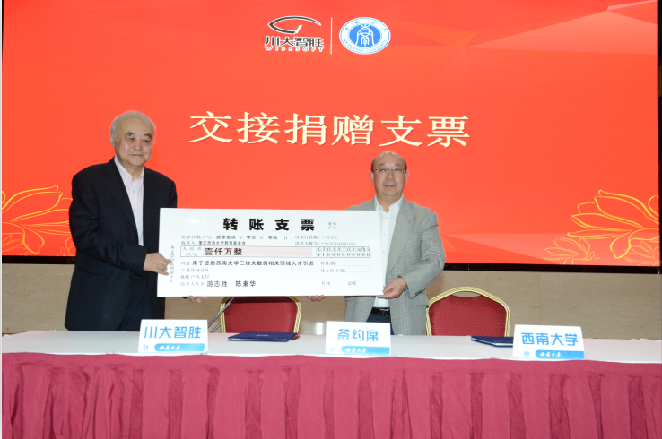 在仪式上,游志胜先生与其夫人陈素华女士以个人名义向贝博艾弗森代言体育官网捐赠1000万元人民币,用于资助学校三维大数据相关领域的人才引进。这将助力学校相关领域的科研工作迈上更高的台阶。陈素华女士是原西南师范学院数学系65级校友,这份捐赠也表达了她对母校的感恩之情。