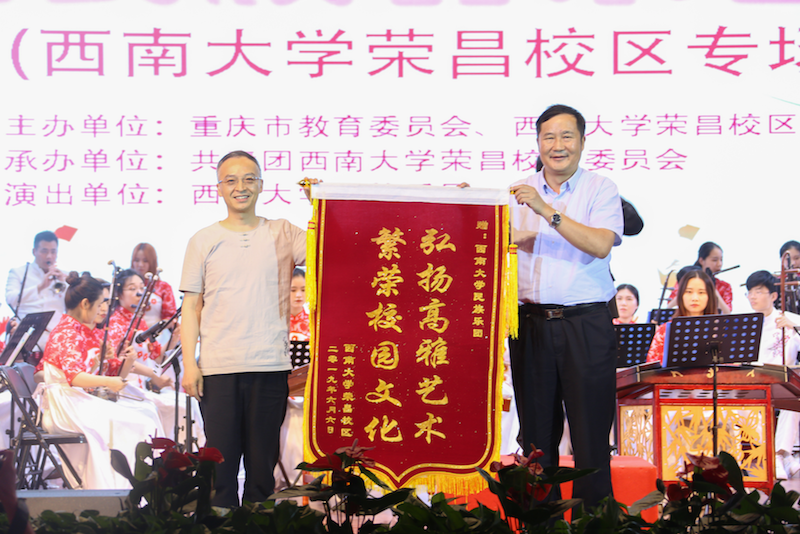 民乐合奏《庆典序曲》和《我的祖国》拉开音乐会序幕,荣昌校区民乐队凭借《赛马》和《牧民新歌》的出色演绎获得全场师生热烈掌声;女声独唱《芦花》旋律优美、乐声舒缓;唢呐独奏《百鸟朝凤》以热情欢快的旋律与百鸟和鸣之声,表现了生气勃勃的大自然景象,极具艺术感染力。演出最后,荣昌校区管委会主任左福元为乐团赠送锦旗,向全体演出人员表示感谢!