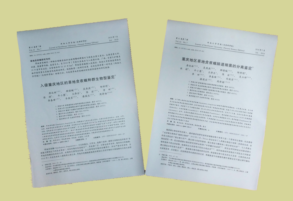 草地贪夜蛾是一种联合国粮农组织全球预警的重大洲际迁飞性农业害虫,自2019年1月从东南亚侵入我国云南、广西以来,已经向北迁飞蔓延了19个省市自治区,主要危害玉米、高粱等大宗粮食作物,危害巨大。该虫快速迁徙引起了国务院的重视,近期农业农村部专门召开了草地贪夜蛾的防控会议,国内许多科研院所也纷纷投入人财物对该害虫进行研究。自今年5月初草地贪夜蛾在重庆发现以来,学校家蚕基因组生物学国家重点实验室潘国庆研究员课题组迅速行动,在重庆市各级农业部门的大力配合下,第一时间从各区县收集虫样,快速开展了草地贪夜蛾生物型和肠道菌群的研究,希望能为我国草地贪夜蛾的综合防控提供第一手的详实数据。《贝博艾弗森代言体育官网学报(自科版)》关注学术热点研究,积极服务于学校重点科学研究,与该课题组紧密合作,及时调整出刊计划,组织精干编辑认真、高效完成了稿件的评审、编辑工作,仅仅用一周时间,课题组两篇关于草地贪夜蛾的最新研究成果《入侵重庆地区的草地贪夜蛾种群生物型鉴定》、《重庆地区草地贪夜蛾肠道细菌的分离鉴定》通过该学报于7月4日在中国知网优先发表,及时发布了国家急需的草地贪夜蛾相关研究报告,为治理草地贪夜蛾提供了基础数据。