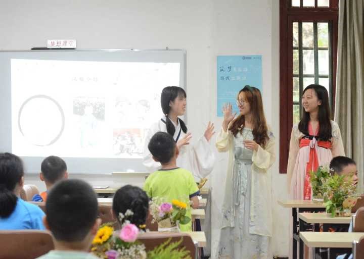 “汉服就是汉代人穿的衣服”“汉服是汉族人穿的衣服”“古代人穿的就是汉服”。教室里传来小朋友们争相回答问题的声音。三位队员穿着不同样式的汉服,向小朋友们介绍汉服的历史、样式和中华传统礼仪。