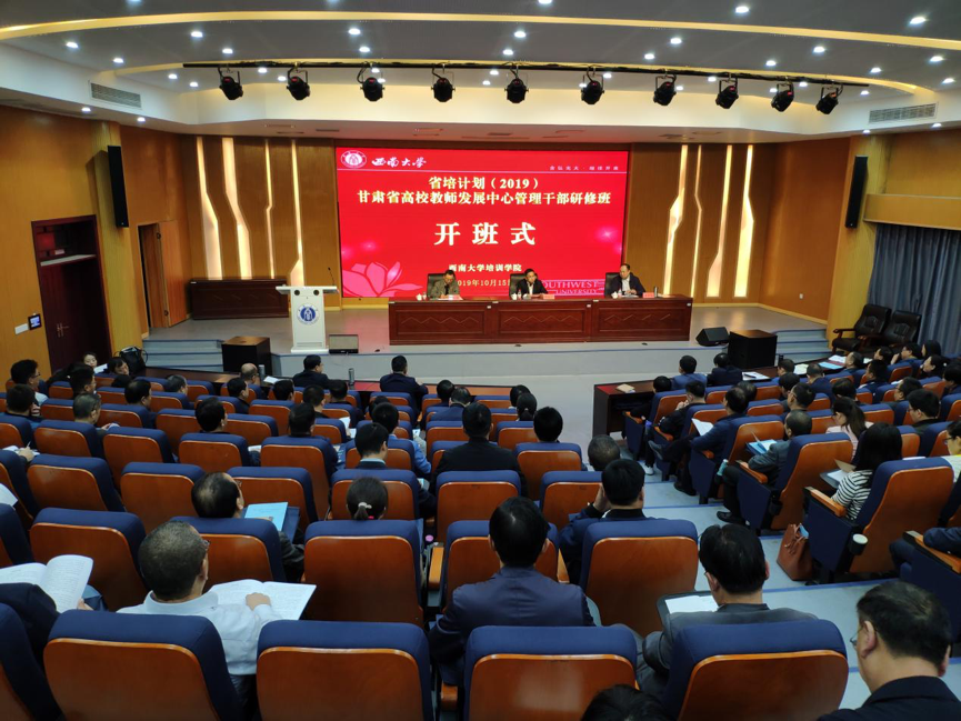 10月15日,2019年甘肃省高校教师发展中心管理干部研修班在校开班。学校副校长陈时见、甘肃省教育厅教师工作处处长温攀玺出席开班式。开班式由学校培训学院副院长曾跃林主持。来自甘肃省46所高校教师发展中心的分管校长、主要负责人共96人参加为期5天的集中研修。