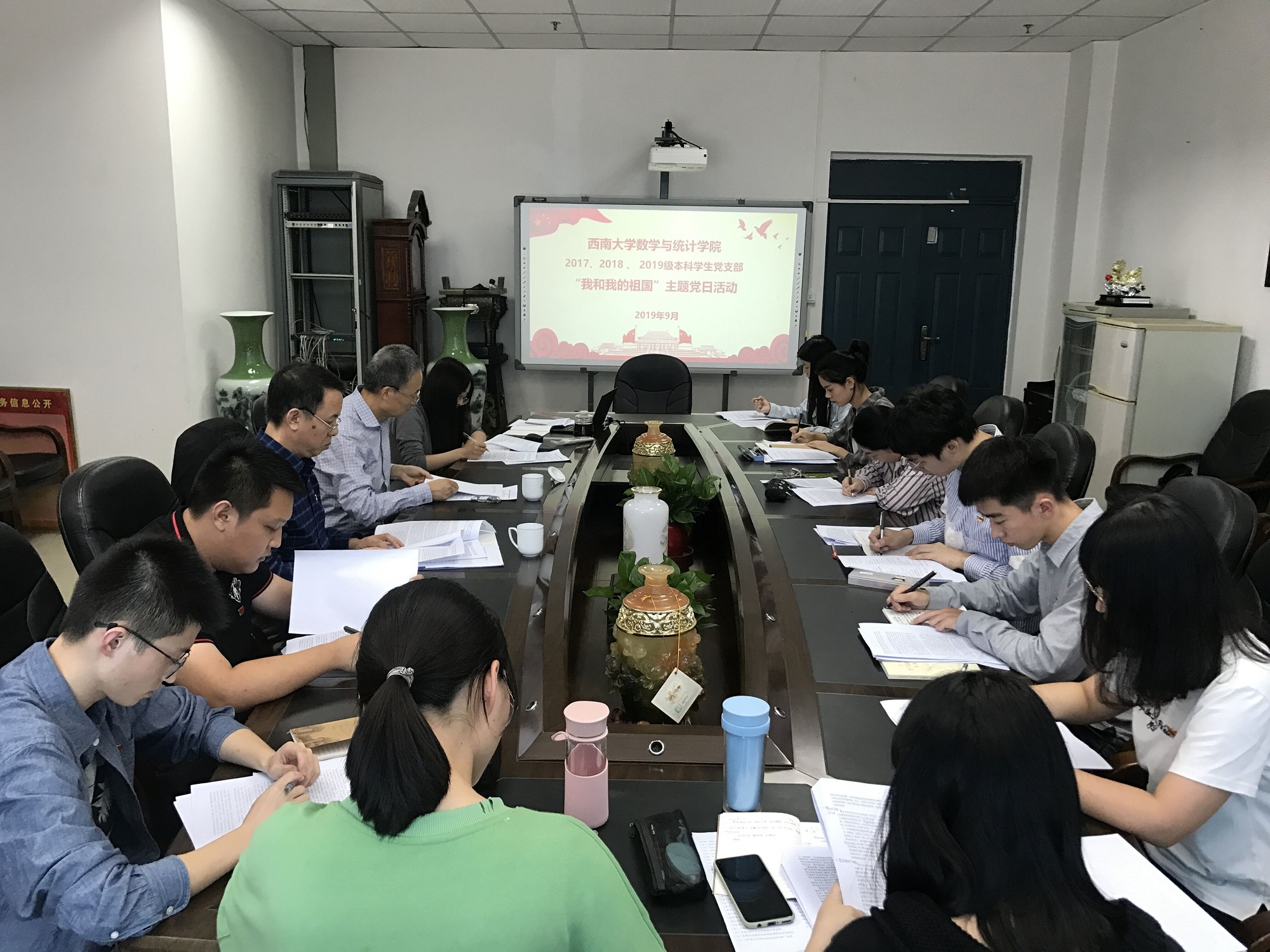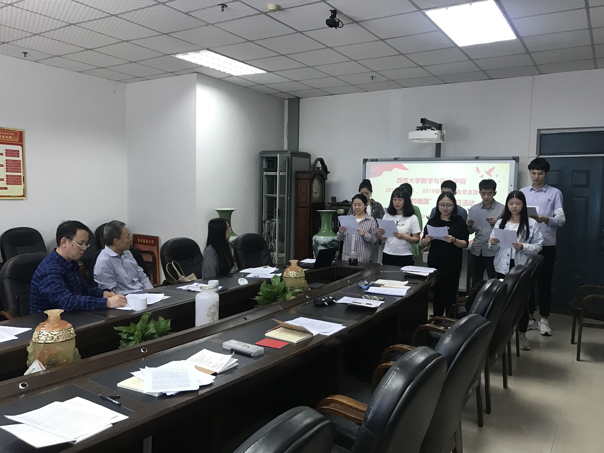 全体与会人员一同观看视频《厉害了,我的国》,全体学生党员朗诵诗歌《中国,我的中国》并合唱《今天是你的生日》。