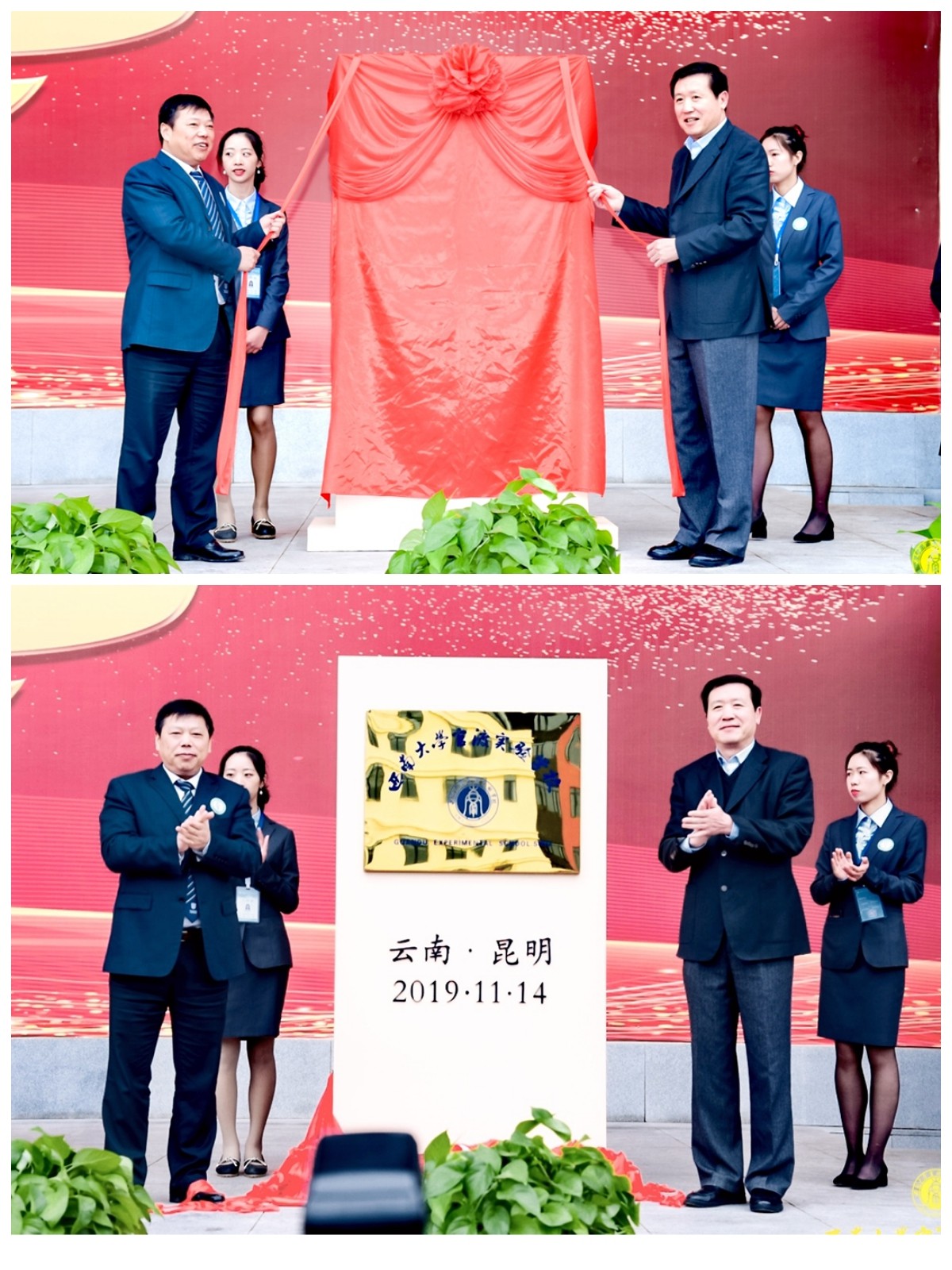 昆明市教育体育局局长穆仁早、官渡区政府代区长周燕,学校副校长陈时见、校办主任葛信勇、基础教育集团董事长邹顺康等参加揭牌仪式。揭牌仪式由官渡区委书记和丽川主持。