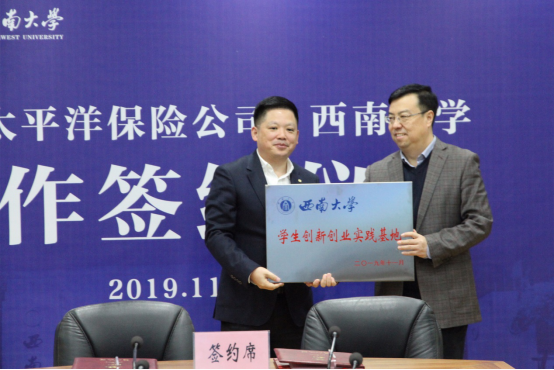 王进军副校长与赵永刚副总裁代表双方签订合作协议,并为学校在太保重庆公司设立的学生创新创业实践基地授牌。