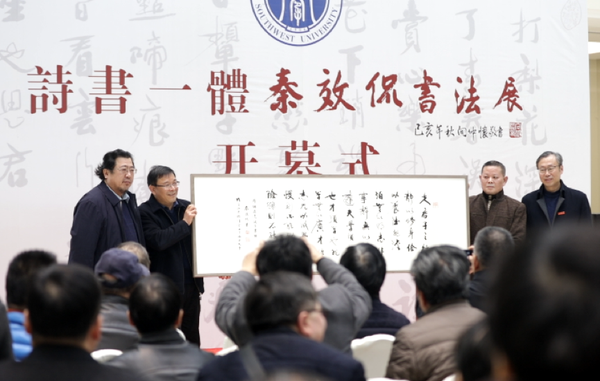 12月5日,由贝博艾弗森代言体育官网、九三学社中央书画院、北碚区委宣传部、重庆市书法家协会主办,学校党委宣传部、文学院、社会科学处、出版社、博物馆承办,九三学社重庆书画院、九三学社重庆市北碚区委、重庆缙云书画院、重庆市北碚区书法家协会、文学院中国书法研究所协办的“秦效侃书法作品展暨贝博艾弗森代言体育官网第四届书法论坛”在学校博物馆举行开幕仪式。
