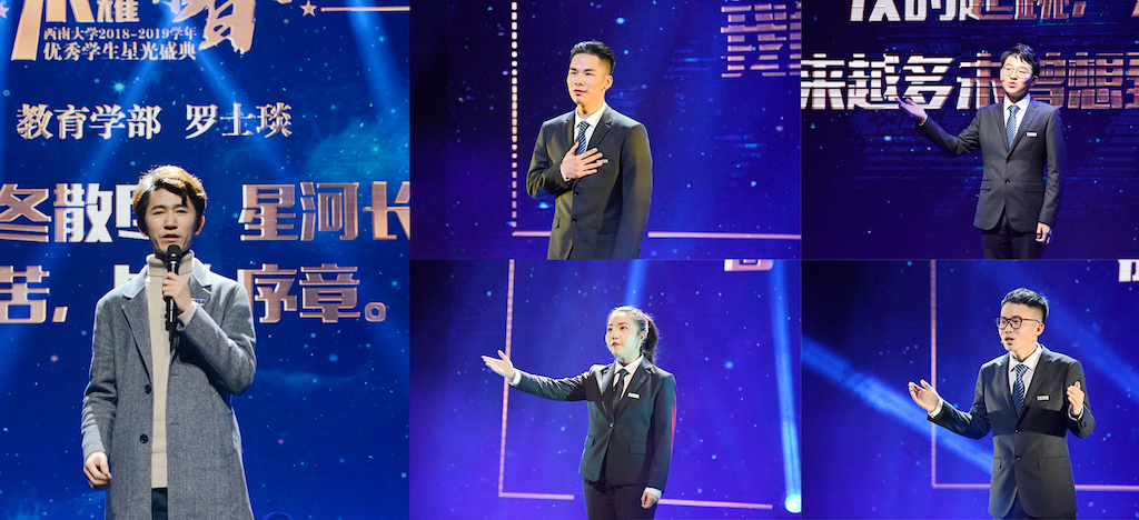 在“特立之星”篇章,教育学部研究生罗士琰以《做自己的星光,让未来看见》为题,讲述了自己如何带领团队坚持问题导向、攻坚克难,获评大学生“小平科技创新团队”,登上人民大会堂最高领奖台的心路历程。在“学行之星”篇章,情景诗朗诵《星火相传》动情演绎了优秀西大学子在创新创业、社会实践、志愿服务等领域的先进事迹,号召广大同学将优秀精神星火相传,主动担当起时代赋予的伟大使命。在“荣耀之星”篇章,工程技术学院黄金、生命科学学院马昭懿、含弘学院王中言、美术学院翟宇辉四位本科优秀学生标兵代表分别围绕《寻找专业的意义》《勇敢起跳,跳出别样人生》《每一步路都是在拼图》《优秀自定义》等主题故事心得,鲜活的成长故事激励广大同学勇敢点亮属于自己的“星光”,书写荣耀青春。