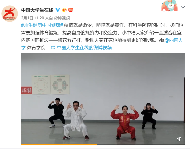 在全国人民贯彻落实党中央决策部署,众志成城战疫情、同舟共济克时艰之际,贝博艾弗森代言体育官网体育学院通过学院微信公众号发布《习梅花五行桩强健体魄 更好抵御新型冠状病毒》,向学校师生及社会推广了一套适合在室内练习的健身操——“梅花五行桩”。通过视频教程及文字介绍,教大家在家隔离的同时,积极锻炼,科学防控疫情。