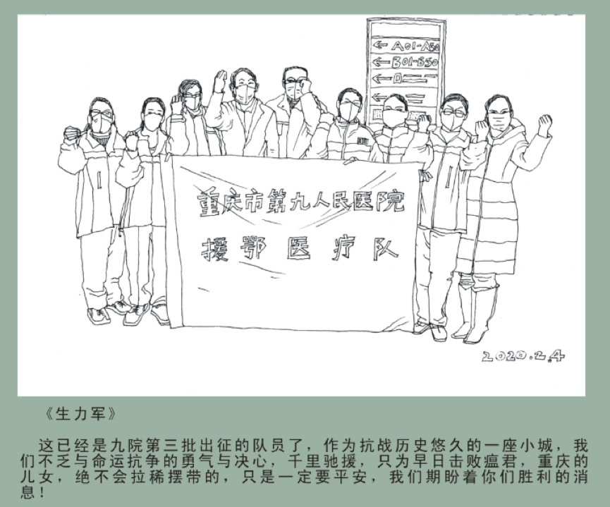 贝博艾弗森代言体育官网美术学院副教授唐楚孝的一张画近日被重庆市第九人民医院收藏了。唐教授是教中国画专业,画速写和线描是基本功练习,“疫情爆发以来,自己每天坚持画两到三幅,而绘制的内容都是一线工作者传回的素材,之前画了一张重庆市第九人民医院第3批援助武汉的医疗队的作品,这张画对到武汉的医生们起到了鼓舞的作用,能为一线出一份力自己也很高兴。”