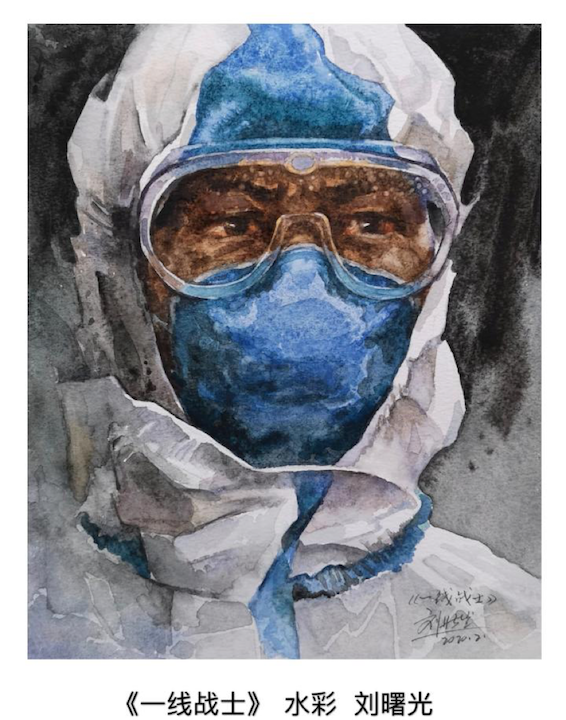 “新闻里那名医务人员的口罩和护目镜差不多挡完了他的脸,只留下一双眼睛,眼神里有些许焦虑,但是更多的是坚定和自信,所以我这张画更多的想集中于眼神和情感的表达。”刘曙光称,面对疫情,中国人没有退缩,没有消沉,而是举国上下万众一心、群防群控,大家都在努力,“我坚信等不了多久必将打赢这场防疫阻击战!”