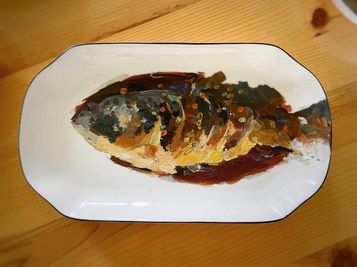 因为手上只剩下一些之前的丙烯颜料和软陶泥,因为疫情的原因,材料也不便购买,陈瑞杰想到:“既然是菜,那肯定就要装进盘子里啊。”就地取材,赶紧让妈妈张罗来了家里的盘子,用剩下的颜料画出了糖醋鱼、梅菜扣肉、炒时蔬等菜肴,还利用软陶泥制作象征团圆的南瓜饼。陈瑞杰把这些“画”的菜和妈妈做的“真”菜肴放在一起,一时间还难辨真假。