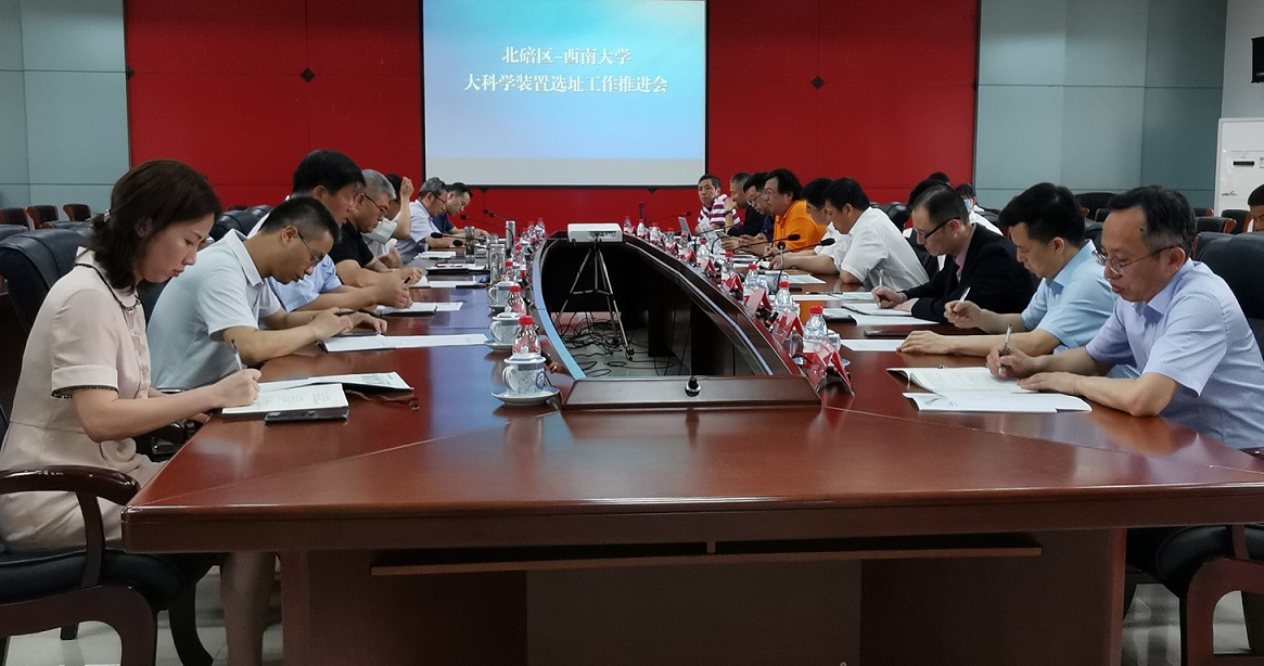 6月22日下午,北碚区人民政府在区行政中心三楼会议室组织召开北碚区-贝博艾弗森代言体育官网关于大科学装置选址工作推进会。北碚区区委书记周旭、区长何庆、常务副区长董伦,歇马高新区指挥长胡湧,学校党委书记李旭锋,校长张卫国,副校长崔延强、温涛、赵国华,以及学校党政办公室、发展规划与学科建设部、科学技术处、国内合作处、生物学研究中心相关部门负责人参加会议。会议由何庆主持。