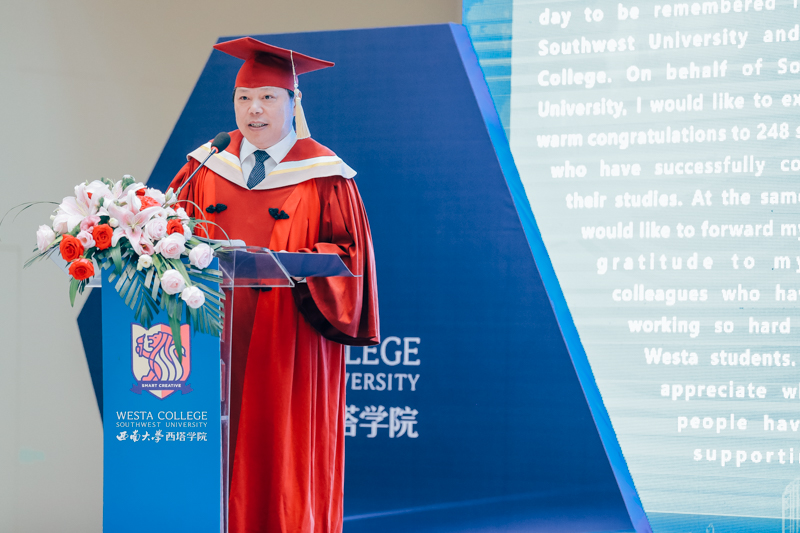 王进军宣读校长激励奖获奖学生名单。西塔学院负责人宣读优秀毕业生表彰决定、毕业决定和授位决定。出席大会的领导、嘉宾为毕业生代表颁发荣誉证书、毕业证书并授位。西澳大学和塔斯马尼亚大学分会场为学生颁发海外课程完成证书。