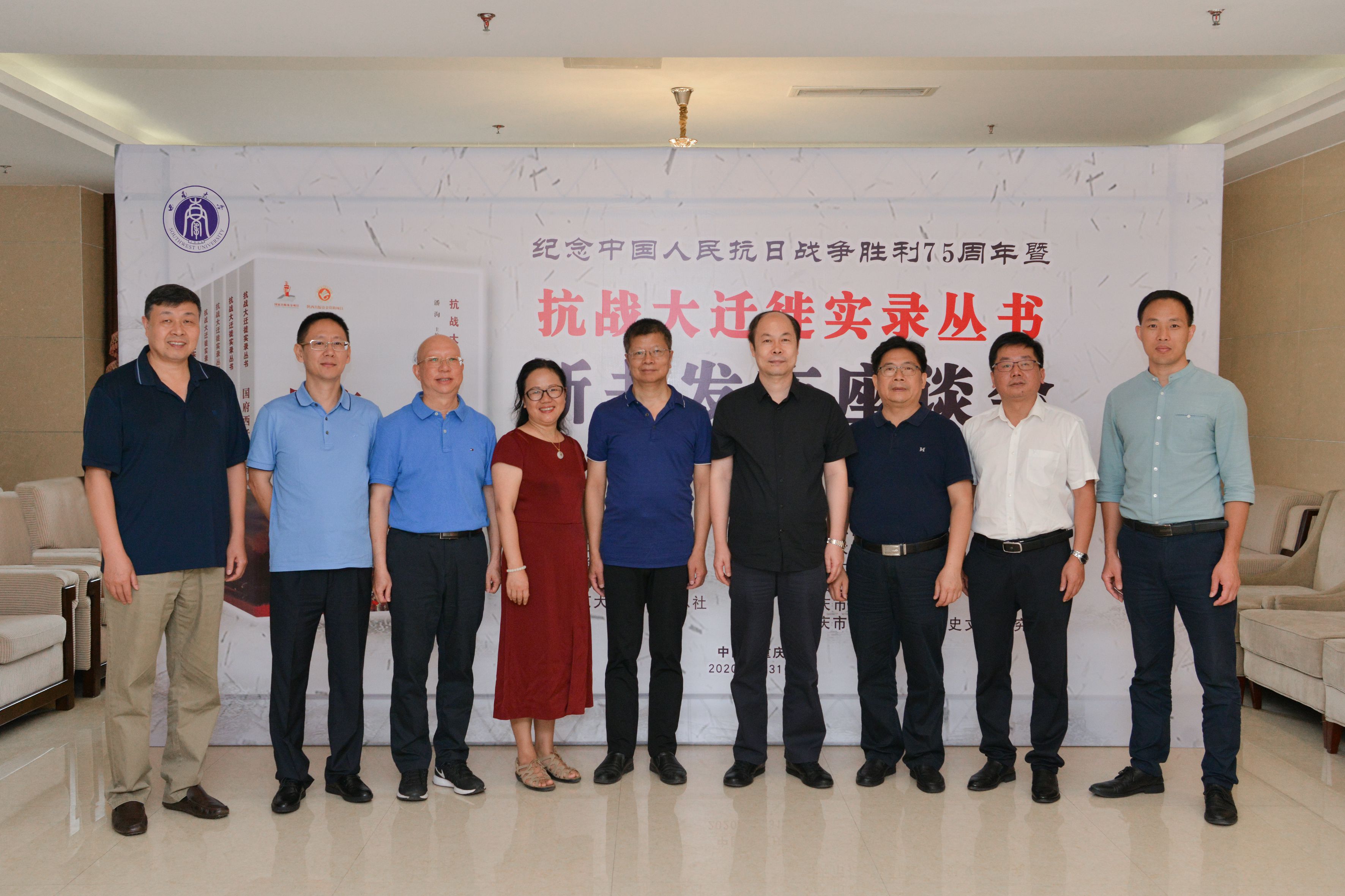 8月31日上午,由重庆市社会科学界联合会、贝博艾弗森代言体育官网、重庆市历史学会、陕西师范大学出版社总社联合主办的“纪念中国人民抗日战争胜利75周年暨‘抗战大迁徙实录丛书’新书发布座谈会”在学校举行。会议由学校历史文化学院负责人主持,学校党委副书记潘洵、重庆市社科联副主席潘勇、重庆中国抗战大后方研究协同创新中心主任周勇、陕西师范大学出版总社董事长兼社长刘东风分别致辞。来自重庆市社会科学界联合会、贝博艾弗森代言体育官网、重庆市历史学会、陕西师范大学出版总社的有关负责人和专家学者50余人参加座谈会。