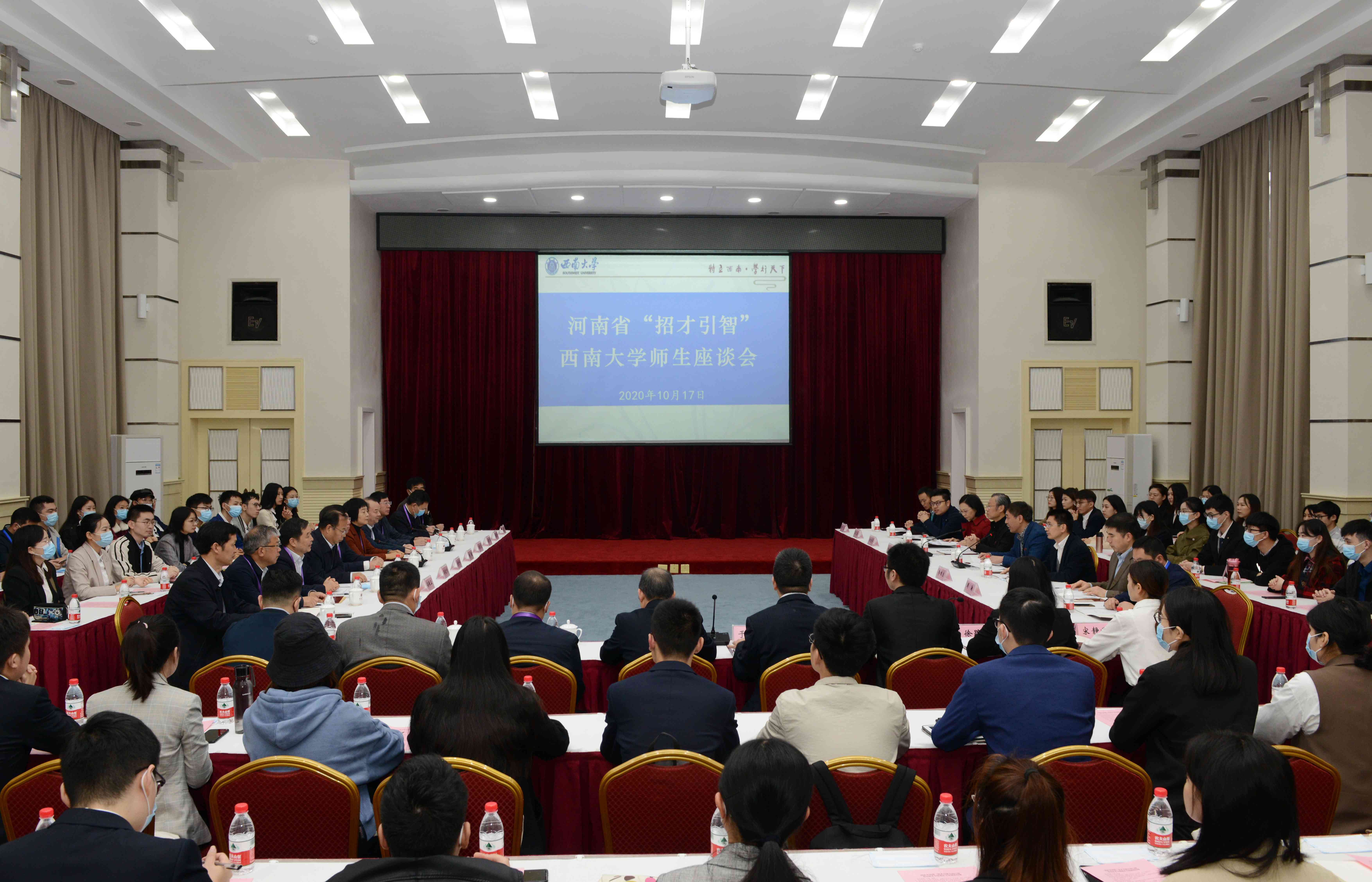 开幕式前,学校在桂圆宾馆金桂厅召开河南省招才引智贝博艾弗森代言体育官网师生座谈会,学校党委副书记安春元、潘洵,河南省人力资源和社会保障厅厅长刘世伟一行,学校相关职能部门负责人,校内河南籍专家教授代表于泽元教授、丁伟教授,有意向前往河南就业的毕业生60余人参加座谈。安春元在座谈会上介绍了贝博艾弗森代言体育官网发展概况,刘世伟介绍了河南发展情况和招才引智优惠政策,于泽元教授、丁伟教授,毕业生代表分别发言。潘洵主持座谈会。