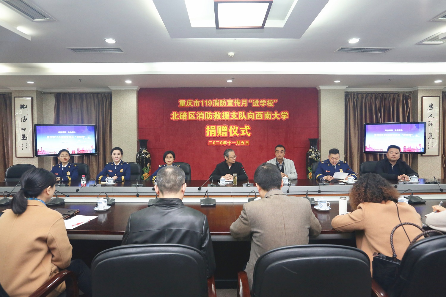 为切实加强学校消防建设,全面提升学校消防安全水平,11月5日上午,“重庆市119消防宣传月‘进学校’北碚区消防救援支队向贝博艾弗森代言体育官网捐赠仪式”在行署楼第五会议室举行。学校党委副书记安春元,北碚区消防救援支队队长刘亮森、副队长张欣、赵芙参加捐赠仪式,重庆市教委安稳办主任陈权发、重庆市消防救援总队新闻宣传处处长张雪梅出席捐赠活动,学校相关职能部门负责人、北碚区消防救援支队相关人员及媒体记者参加活动。