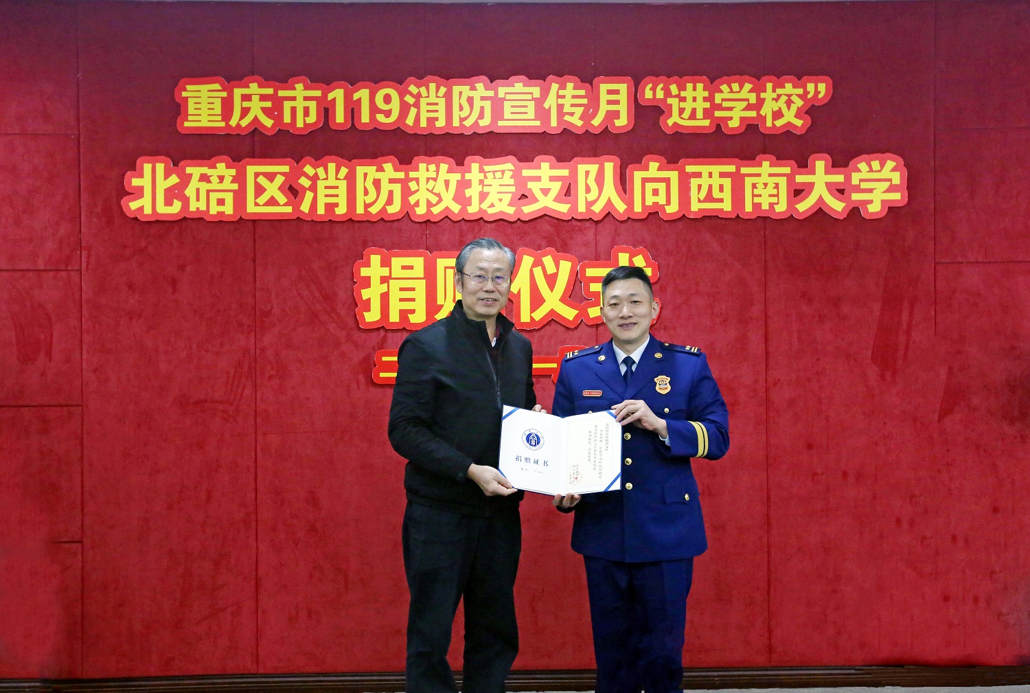 安春元向长期关心支持学校消防安全工作的北碚区消防救援支队表示感谢。他指出,学校非常珍视这次捐赠与合作,将进一步强化政治自觉,压牢压实消防安全工作责任;狠抓隐患排查,抓紧抓细消防安全工作措施;强化消防基础,推动消防安全水平提档升级;加强宣传教育,促进消防安全理念入脑入心,全力建设安全校园,为平安北碚贡献力量。