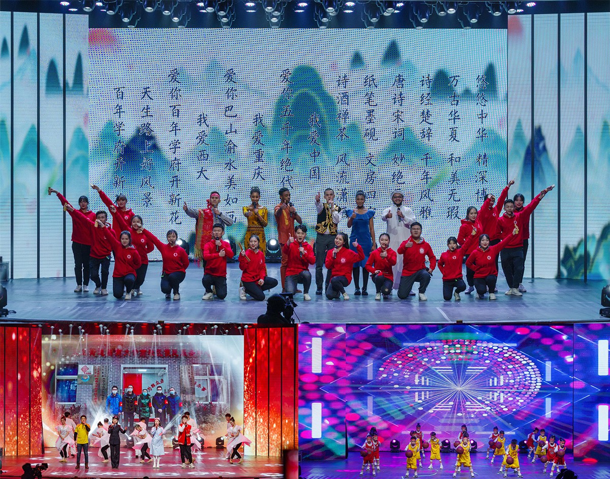 第一篇章“活力校园”由来自校学生艺术团、马克思主义学院和国际学院的中外学生带来原创快板《天生路上新风景》展开,快板打出了天生路上的新变化、新景观,也打出了贝博艾弗森代言体育官网的新风貌、新发展。实验幼儿园篮球宝贝和体育学院带来的《七彩青春》,绽放了活力少年的运动激情与艺术体操的曼妙唯美;第二篇章“战疫亮光”伴随着大提琴演奏以主持人的《抗疫颂》拉开序幕。在新闻传媒学院的情景诗歌诵读《春深似海,等你归来》《亲爱的母亲,坚强的中国》中,展现了西大人在抗击疫情中的铮铮风骨,诉出“生命至上、举国同心、舍生忘死、尊重科学、命运与共”的抗疫精神。音乐学院的原创歌舞《风雨同舟》,展现学校与国家、人民风雨同舟的使命担当;第三篇章“大地飞歌”磅礴开启,音乐学院独唱《醉美黄水》、学生艺术团歌舞《星光》演绎了西大人决战脱贫攻坚的初心与坚守,诠释了西大人“特立西南,学行天下”的大学精神;第四篇章“红色传承”以情景讲述《一份校史档案背后的故事》开幕,这是学校原创的“校史教育融入四史教育”节目,首次揭秘红岩烈士江姐到贝博艾弗森代言体育官网前身国立女子师范学院发展党员的佳话,以一份学籍档案袋作为线索,向观众讲述江姐鲜为人知的革命往事。随后,荣昌校区情景舞蹈《信仰》、附中师生歌伴舞《妈妈教我一支歌》、历史文化学院民族学院歌舞《中华一家亲》依次上演,传达了携手共同实现中华民族伟大复兴的坚定信念;晚会尾声,音乐学院师生阿卡贝拉人声合唱团饱含深情演唱《我和我的祖国》《走向复兴》,将整场晚会气氛推向高潮。