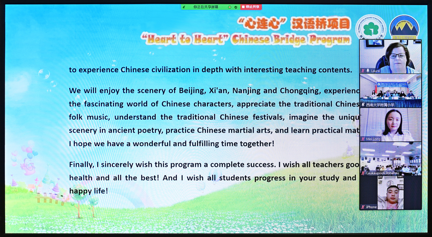 1月4日,由中国教育部中外语言交流合作中心主办,学校承办的贝博艾弗森代言体育官网附属小学与美国贝兹小学“心连心”汉语桥线上交流项目开营仪式顺利举行。学校附属小学、美国贝兹小学主要负责人出席开班仪式并致辞。参加开营仪式的还有附属小学汉语桥项目授课教师、国际合作与交流处相关负责人以及贝兹小学中文沉浸项目班的60名同学。
