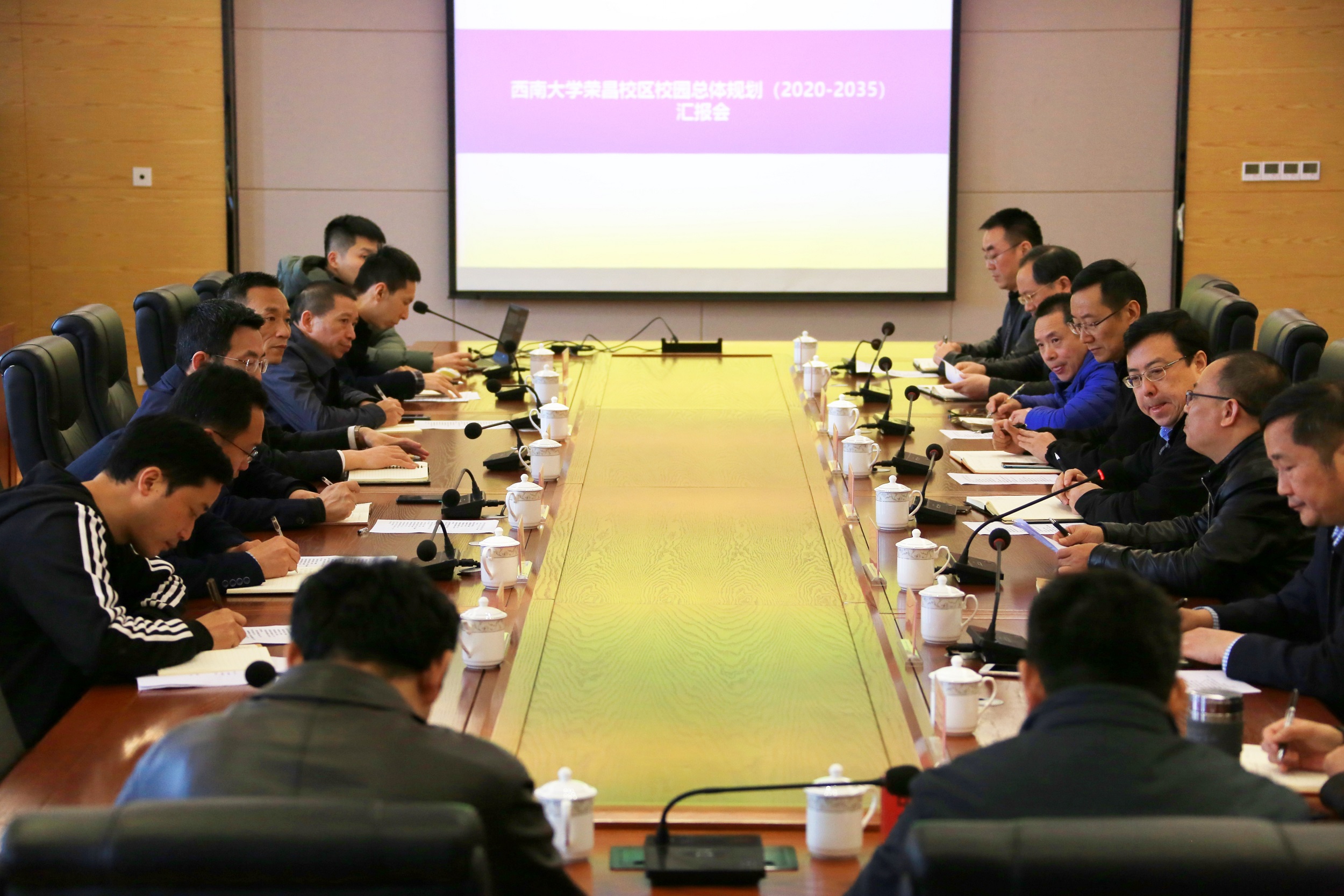 重庆大学规划设计院就荣昌校区校园建设规划(2020-2035)方案(讨论稿)做汇报,从现状背景、周边限制因素、方案历程、方案内容、各板块的功能定位、前后方案对比等方面有针对性地对方案进行了详实的阐述。与会人员就规划方案内容充分发表意见和建议。