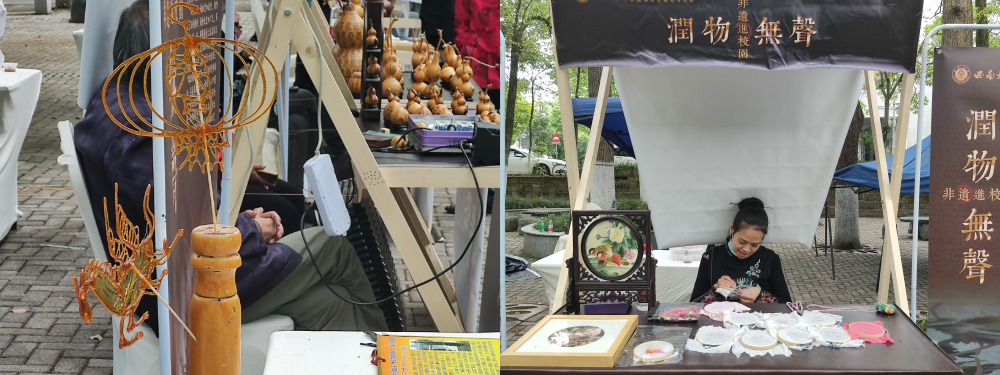 本次活动展出的荣昌陶器是中国四大名陶之一,起源于汉代,兼具观赏性和实用性,有“红如枣、薄如纸、声如磬、亮如镜”的美誉,学校和荣昌区共建的“贝博艾弗森代言体育官网荣昌非物质文化遗产研究中心”在现场展示荣昌陶器的制作流程及其精美艺术品。夏布是荣昌著名的传统手工艺品,以独特的编织工艺被评为我国非物质文化遗产,作为教育部首批中华优秀传统文化传承基地的贝博艾弗森代言体育官网“重庆荣昌夏布织造技艺传承基地”师生团队重点展示了夏布制作工艺及其精美艺术品。活动还邀请重庆市级非遗传承人进校园现场展示糖画、捏面人、葫芦烙画、蜀绣等传统技艺的制作过程,师生通过现场互动进行深入了解。