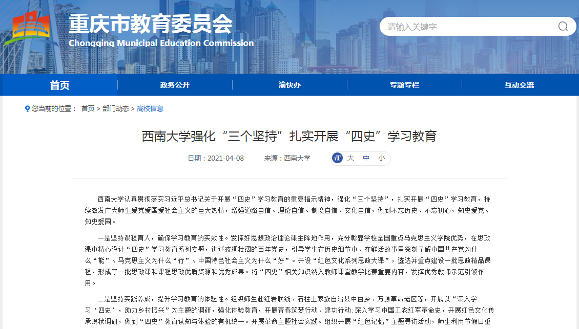 4月8日,重庆市教育委员会官网报道学校强化“三个坚持”扎实开展“四史”学习教育,报道原文如下。