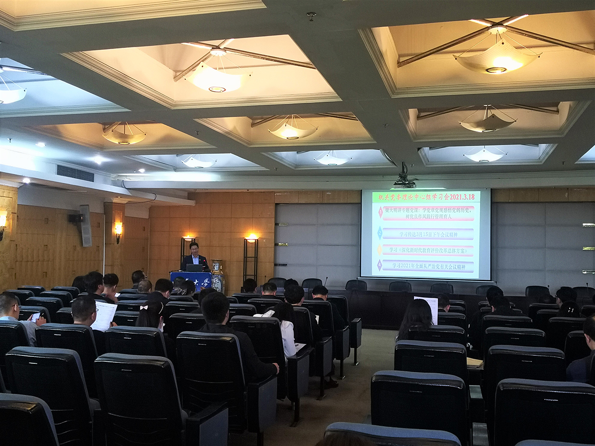 “机关党员干部要走在前作表率,落实‘三全育人综合改革’工作,加强机关作风建设,践行‘一线规则’,用实际行动推进党史学习教育……”。机关党委常务副书记梁大明在机关党委理论中心组学习会上以《学党章党规感悟党的历史,树优良作风践行管理育人》为题讲了专题党课,进行工作部署,拉开机关党委党史学习教育帷幕。