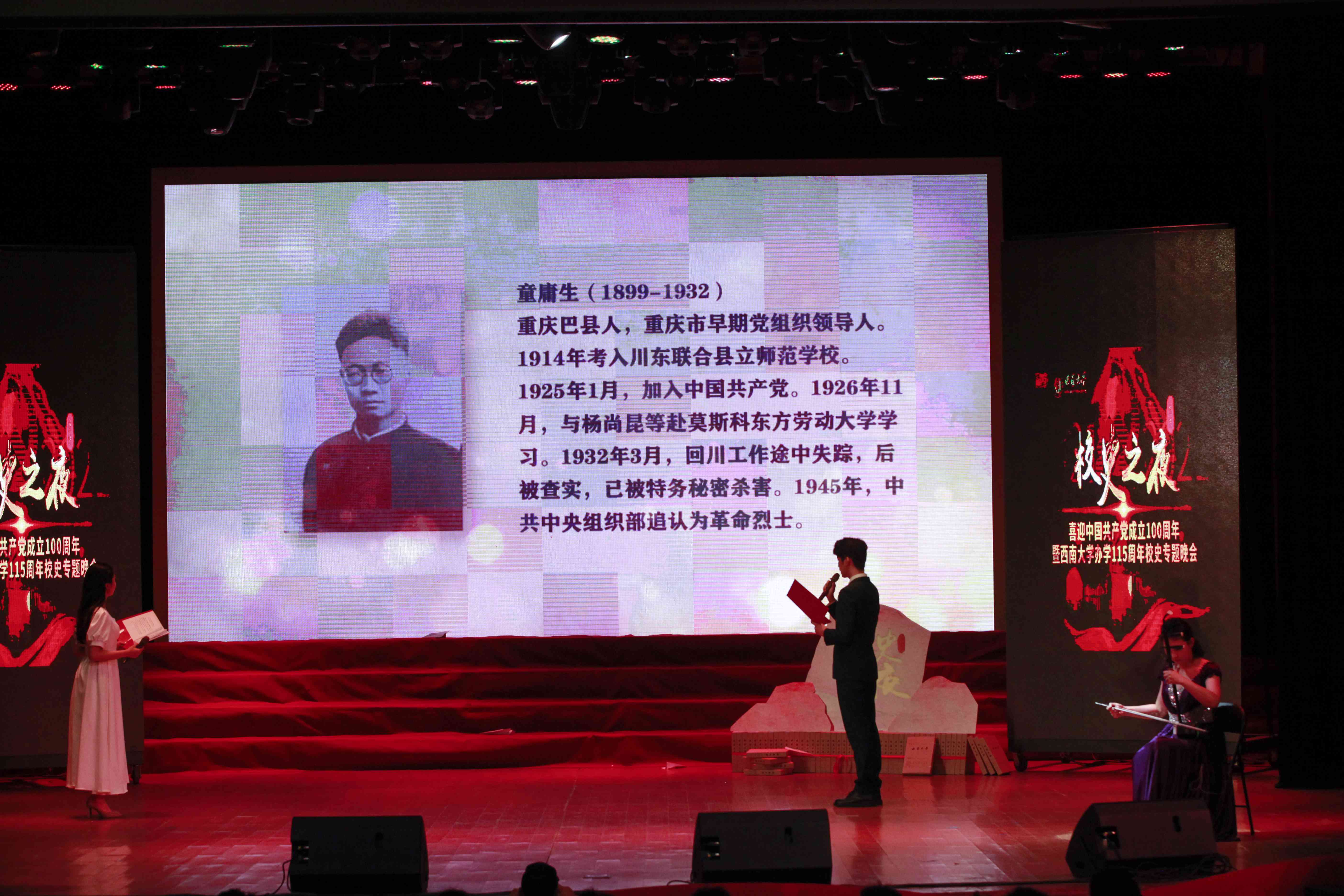 晚会上,学校校史宣讲团学生们重新翻唱了校史上的四首老校歌。最早的川东师范校歌则是百余年后首次被重唱。作为本次晚会分量最重的节目,学校档案馆正式发布了历时三个多月挖掘、查考而梳理出的《贝博艾弗森代言体育官网校史烈士名录》。为民族独立和解放、为新中国的诞生和保卫新政权而牺牲的26位烈士英雄事迹也首次被发掘出来。