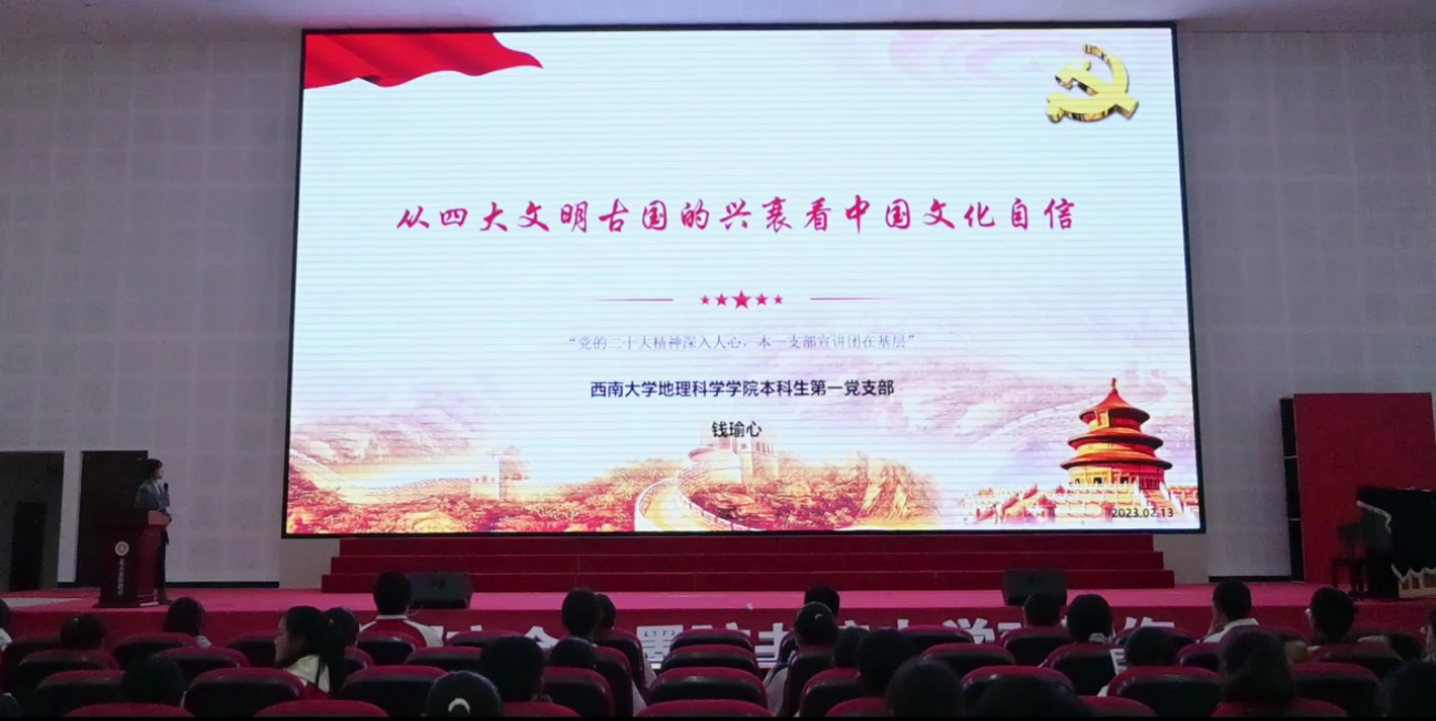 自1月13日以来,宣讲团历时37天,在11个社区、3所学校、3个村委会和2个企业单位陆续开展宣讲19场,覆盖受众450余人。宣讲内容丰富,重点突出,既有政治高度、思想深度,又有理论温度、实践厚度,让党的创新理论“飞入了寻常百姓家”。下一步,地科科学学院党委将继续全面深入学习宣传贯彻党的二十大精神,强组织、搭平台、聚合力、增效能,学用结合、知行合一,真正把学习贯彻党的二十大精神转化为奋进新征程、建功新时代的强大动力。