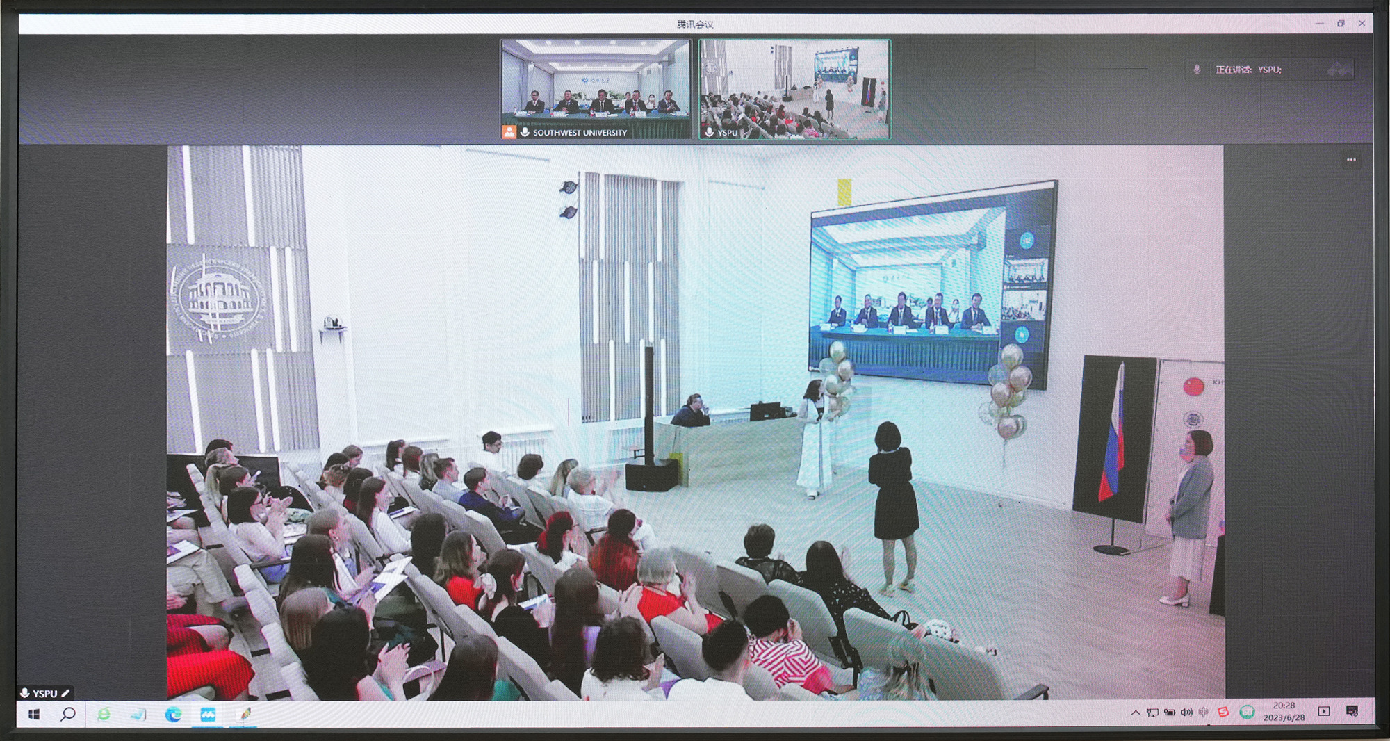 6月28日,学校与俄罗斯雅罗斯拉夫尔国立师范大学(以下简称:雅师大)首届联合培养英汉双语师范专业本科学生毕业典礼暨学位授予仪式在重庆和雅罗斯拉夫尔两地以线上线下方式同步顺利举行。副校长赵国华,国际合作与交流处、外国语学院、体育学院相关负责人在线参加仪式;雅师大校长格鲁兹杰夫、外语系主任阿维玲娜、中国语言文化教育中心俄方代表克拉特诺娃、中俄双方教师在俄罗斯线下参加仪式。