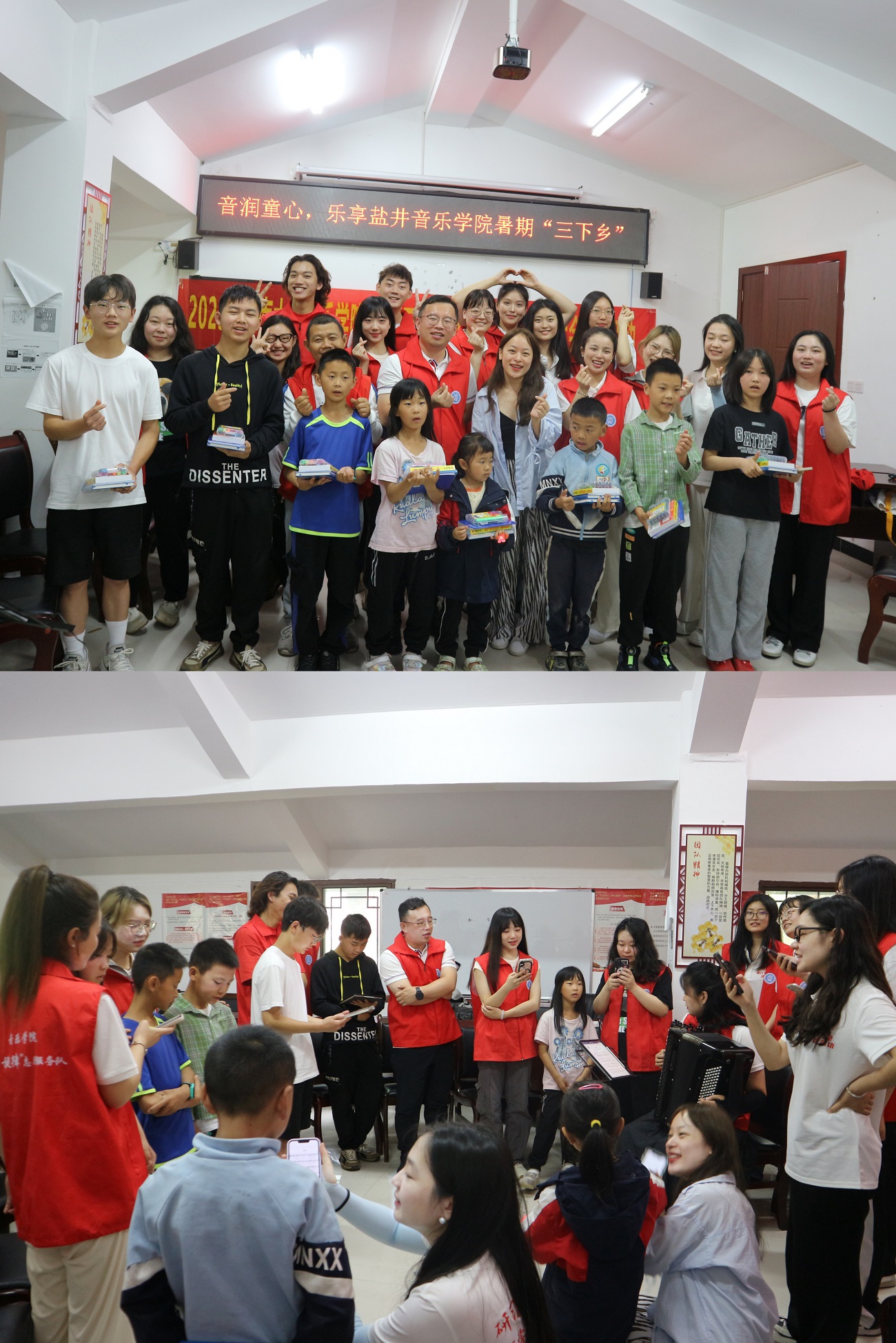 4日,实践队前往中益乡盐井村践行美育乡村,用音乐关爱留守儿童,暖心田、润童心,开展满怀期待的音乐课。隔代养育、长期与父母分别等现实情况,使得留守儿童存在着隐性或者显性的情感缺失,大多表现得内敛、敏感、偏激。实践队队员们带领小朋友们认识、鉴赏手风琴、巴松、古琴等乐器,引导小朋友们通过音乐去记录记忆,表达情感,使得心灵得到疗愈,最后教唱了一曲合唱《送别》,给小朋友们埋下了深深的音乐情感寄托。课堂结束后,实践队为留守儿童们送上文具和读物,希望通过这样一次行动为留守儿童们点亮一盏灯。