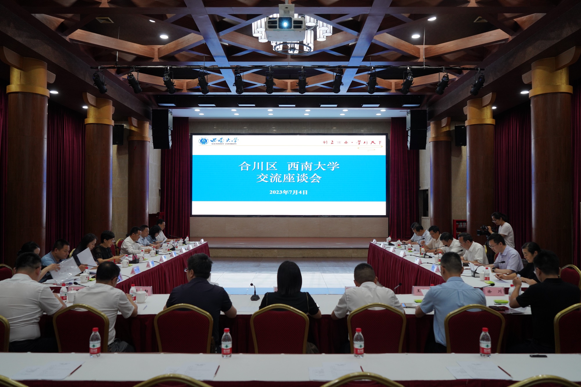 7月4日,合川区人民政府来校推进区校合作事宜。学校校长张卫国、副校长王志坚,合川区委副书记、区长姜雪松、常务副区长曾荣、副区长袁晓钦等出席会议。会议由王志坚主持。