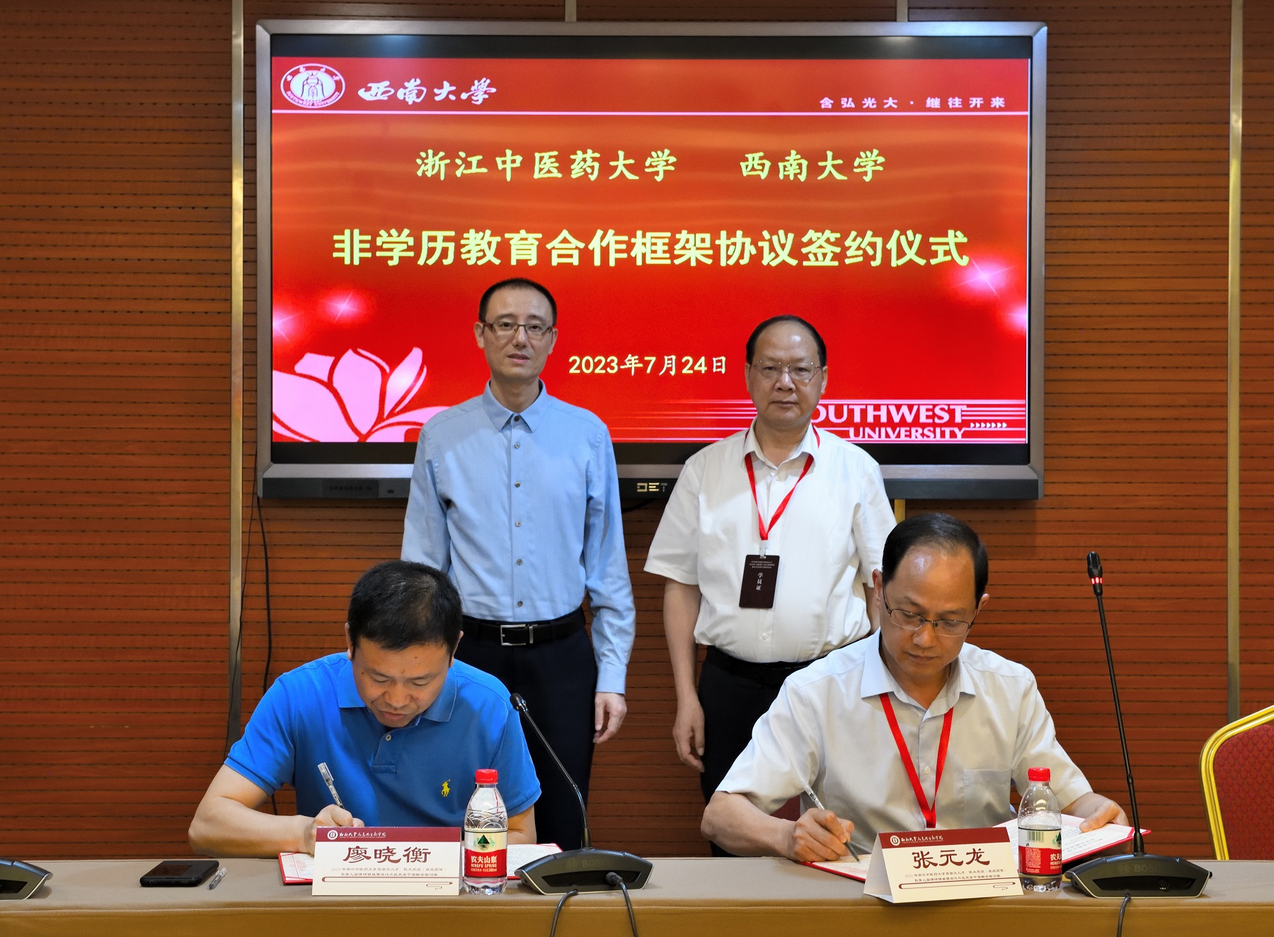 为进一步深化交流合作,提高干部、教师队伍综合素质能力,推进高等教育事业高质量发展,增强浙渝两地高校服务国家和地方经济社会建设发展,7月24日下午,浙江中医药大学与学校非学历教育合作协议在贝博艾弗森代言体育官网举行签约仪式。浙江中医药大学党委书记黄文秀、党委副书记张元龙,学校党委副书记黄杰等领导出席此次签约仪式。党委宣传部 党委网络工作部部长,马克思主义学院党委书记廖晓衡主持开班仪式。
