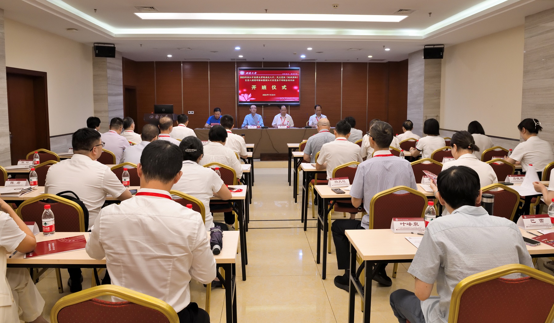 签约仪式后,2023年浙江中医药大学高层次人才、民主党派(统战团体)负责人国情研修班暨滨江片区党务干部联合培训班在学校同期开班。浙江中医药大学遴选出的五十位高层次人才、民主党派(统战团体)负责人、部分党务干部组成的首批联合培训班学员们将重点围绕学先贤、悟党史,传承红岩精神等内容,在重庆进行为期五天的培训。