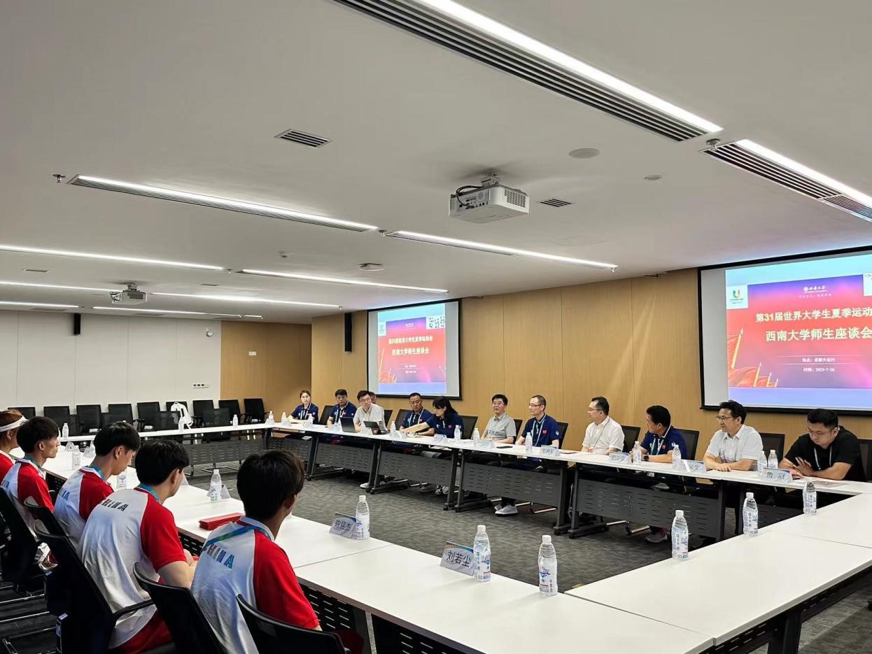 7月26日,党委书记李旭锋、党委副书记黄杰率相关部门负责人,赴成都世界大学生运动村慰问学校参与成员,并开展座谈交流会。学校领导、大体协竞赛部主任中国代表团副秘书长程洁、学校相关部门负责人及在村师生参加座谈交流会。黄杰主持会议。
