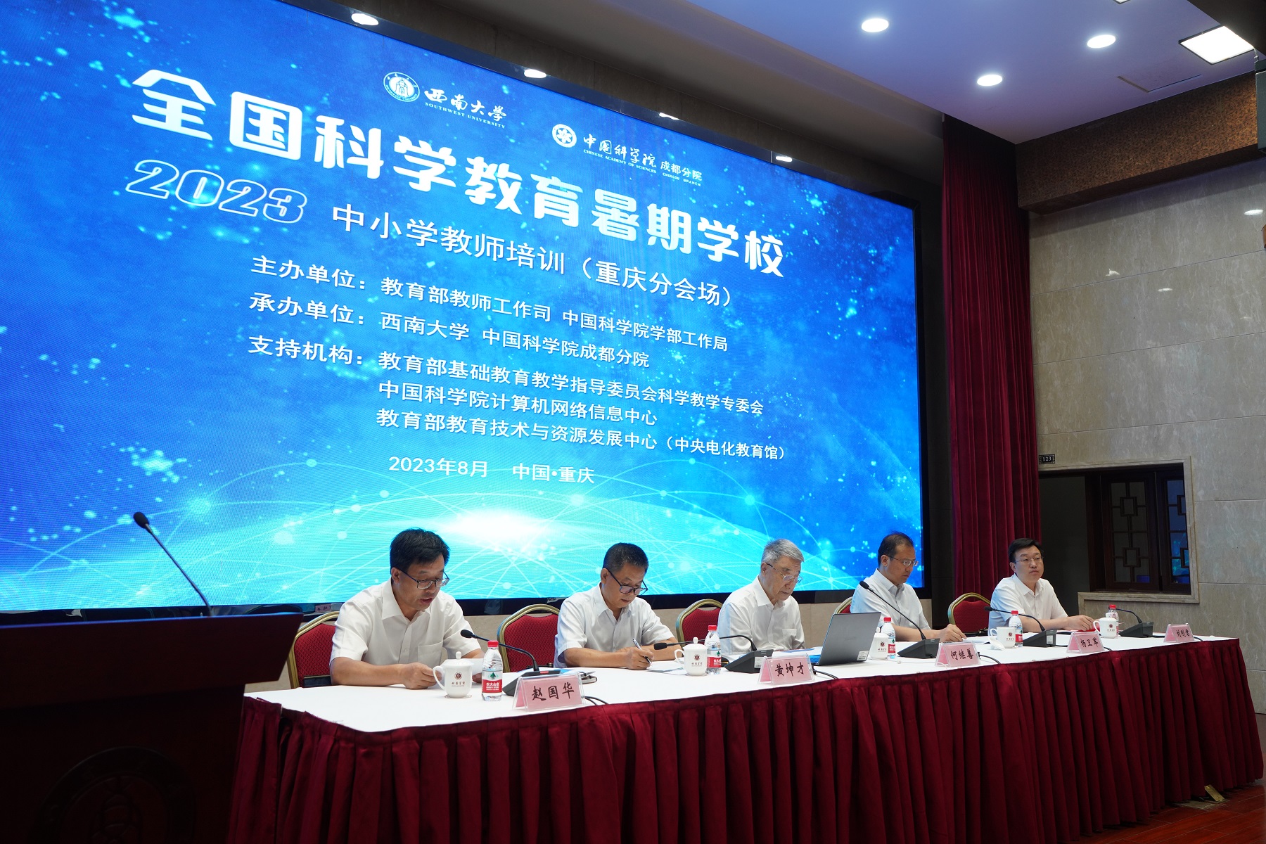 为深入贯彻党的二十大精神,全面落实习近平总书记关于在教育“双减”中做好科学教育以及科普工作和科学素质建设的重要指示精神,自去年起,教育部、中国科学院共同实施“全国科学教育暑期学校”中小学教师培训活动,提升教师科学素养,夯实科学教育高质量发展的师资基础。8月14日,“全国科学教育暑期学校”中小学教师培训(重庆分会场)在学校开班,学校副校长赵国华、重庆市教育委员会副主任杨卫军、重庆市科学技术协会二级巡视员黄坤才、中国科学院成都分院系统单位党委副书记刘刚君等出席开班仪式。102名来自重庆市、四川省、西藏自治区的小学科学教师和教研员代表线下参训。