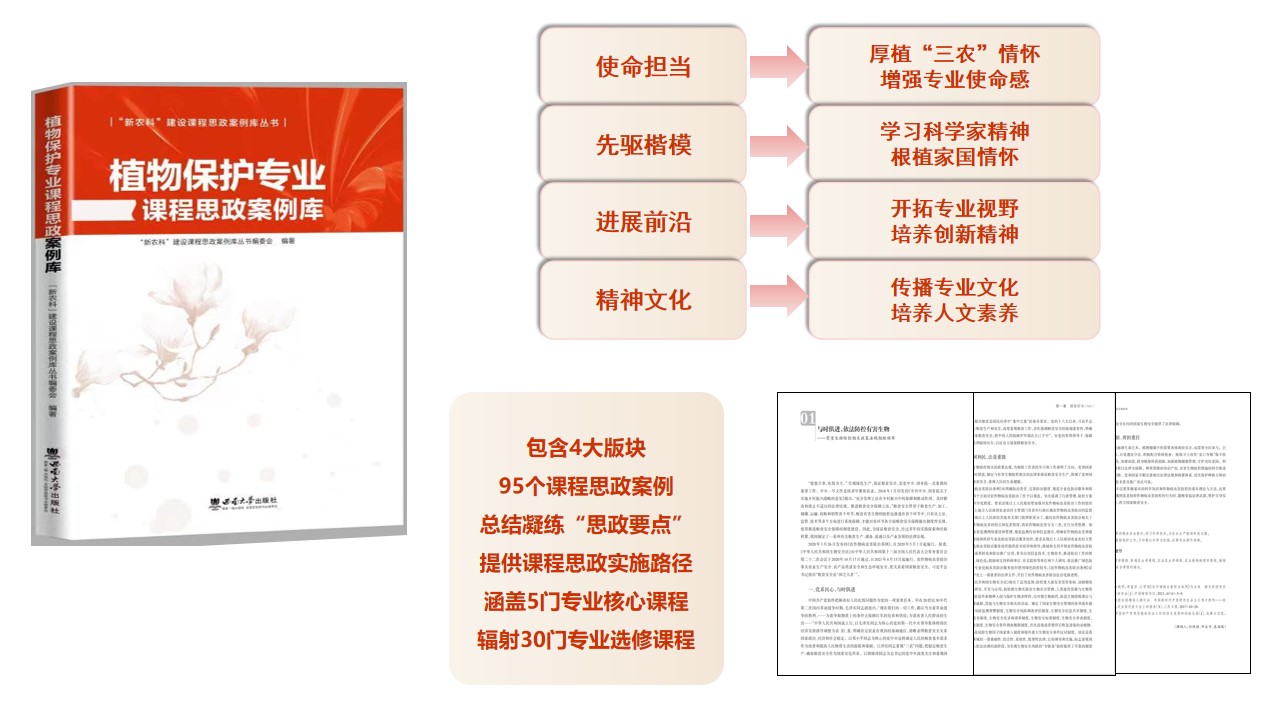近日,植物保护学院由植物保护专业负责人王进军教授牵头组织全院教师编写的《植物保护专业课程思政案例库》,作为学校“新农科建设课程思政案例库”丛书第一辑,由贝博艾弗森代言体育官网出版社正式出版发行。