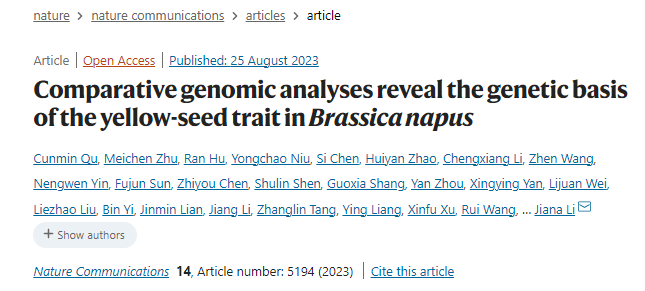 8月25日,油菜分子生物学研究团队李加纳教授/曲存民教授在Nature Communications发表了题为Comparative genomic analyses reveal the genetic basis of the yellow-seed trait in Brassica napus的研究论文,该研究通过甘蓝型油菜黄籽GH06和黑籽中油821高质量基因组的组装,围绕控制种皮色泽主效QTL区间,成功克隆了一个控制油菜种皮色泽重要基因,并解析了其参与调控种皮色泽形成和类黄酮代谢的分子机制,为油菜品质性状改良提供了新的分子策略。