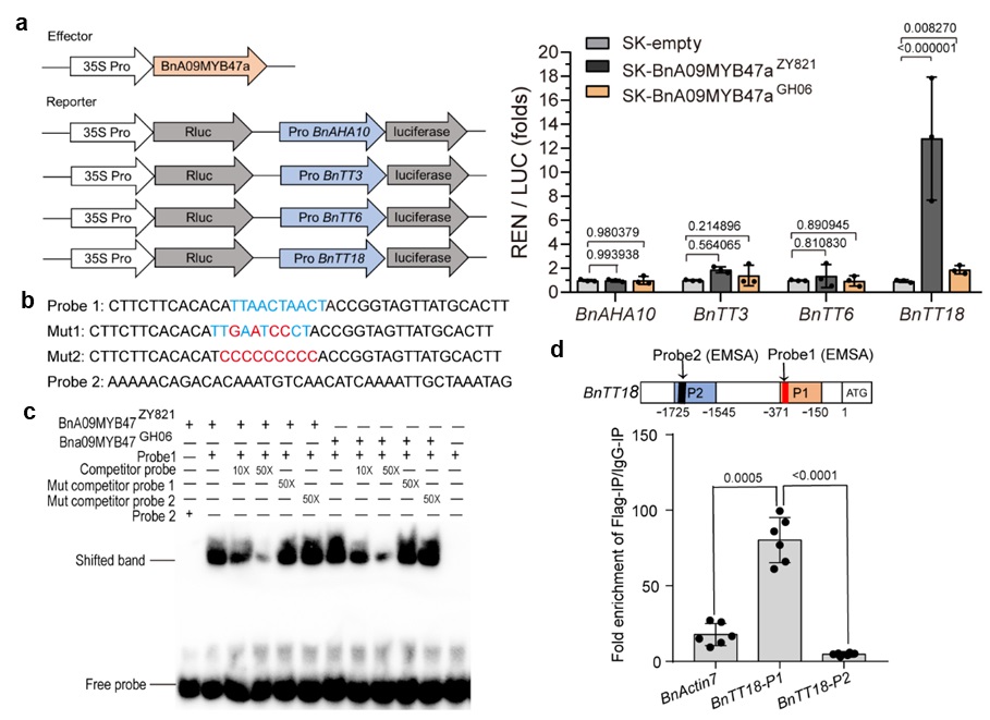 通过对过表达/沉默BnA09MYB47a转基因油菜研究,发现该基因与种皮色泽呈现正相关,还影响了芸薹属作物种皮色泽性状的重要组成成分表儿茶素、山奈酚、异鼠李素和花青素苷及其衍生物等类黄酮代谢产物的合成(图2)。此外,序列变异是黄籽和黑籽油菜BnA09MYB47a功能差异的基础,双荧光素酶试验、EMSA和ChIP-qPCR等体内外实验证明黑籽等位基因BnA09MYB47aZY821通过直接激活BnTT18的表达来促进黄酮类化合物的生物合成,而黄籽等位基因BnA09MYB47aGH06无显著调控作用(图3)。综上所述,该研究丰富了甘蓝型油菜参考基因组数目,特别是继唯一已公布的No2127黄籽参考基因组之后补充了新的黄籽基因组,为黄黑籽油菜基因组深入研究、优异基因资源的挖掘利用,培育高商业价值的油菜,促进芸苔属作物中黄酮类化合物合成代谢调控的分子机制研究提供理论依据和资源。